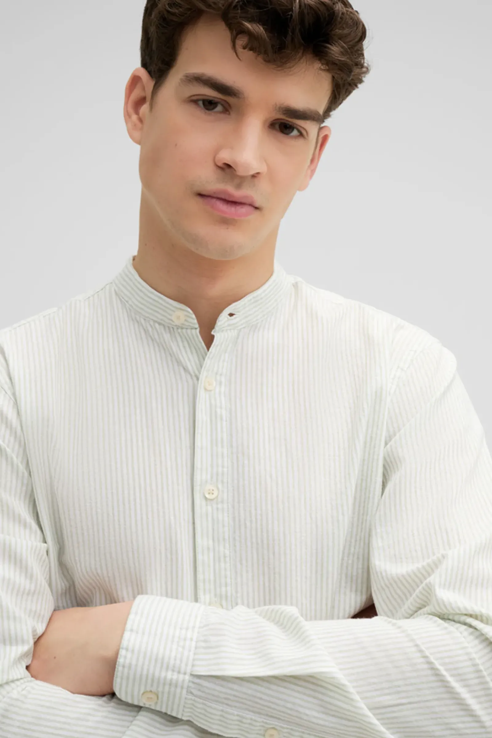 Überzeugt mit schmalem Stehkragen im Streifen-Look: das Hemd Cornel aus Cotton und Leinen. Eine Schulterpasse mit Falten-Detail runden das Piece ab.