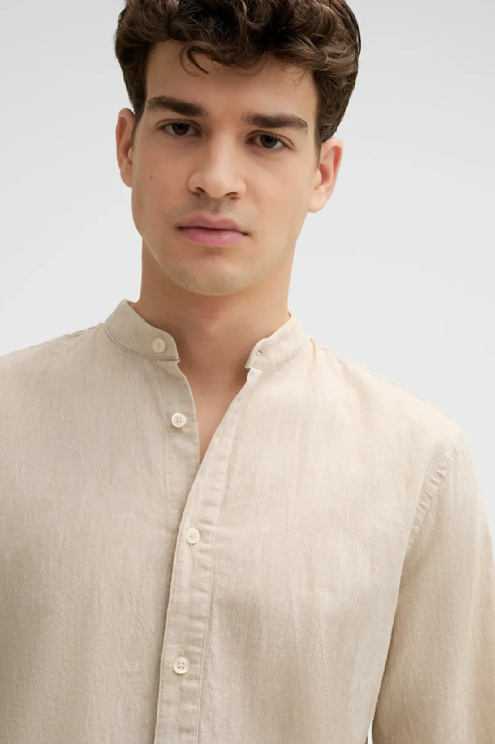 Als komfortables Essential begeistert das Hemd Cornel im Cotton-Leinen-Mix mit schmalem Stehkragen, Schulterpasse mit Falten-Detail und abgerundetem Saum.