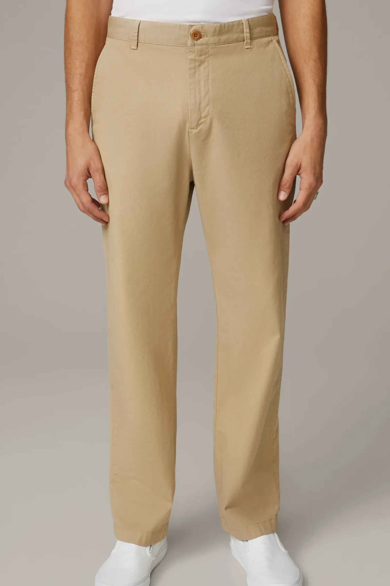Im LOOSE FIT mit geradem Beinverlauf: die Chino Joe punktet mit stretchiger Denim-Qualität und paspelierten Pattengesäßtaschen mit textilem Logo-Patch.