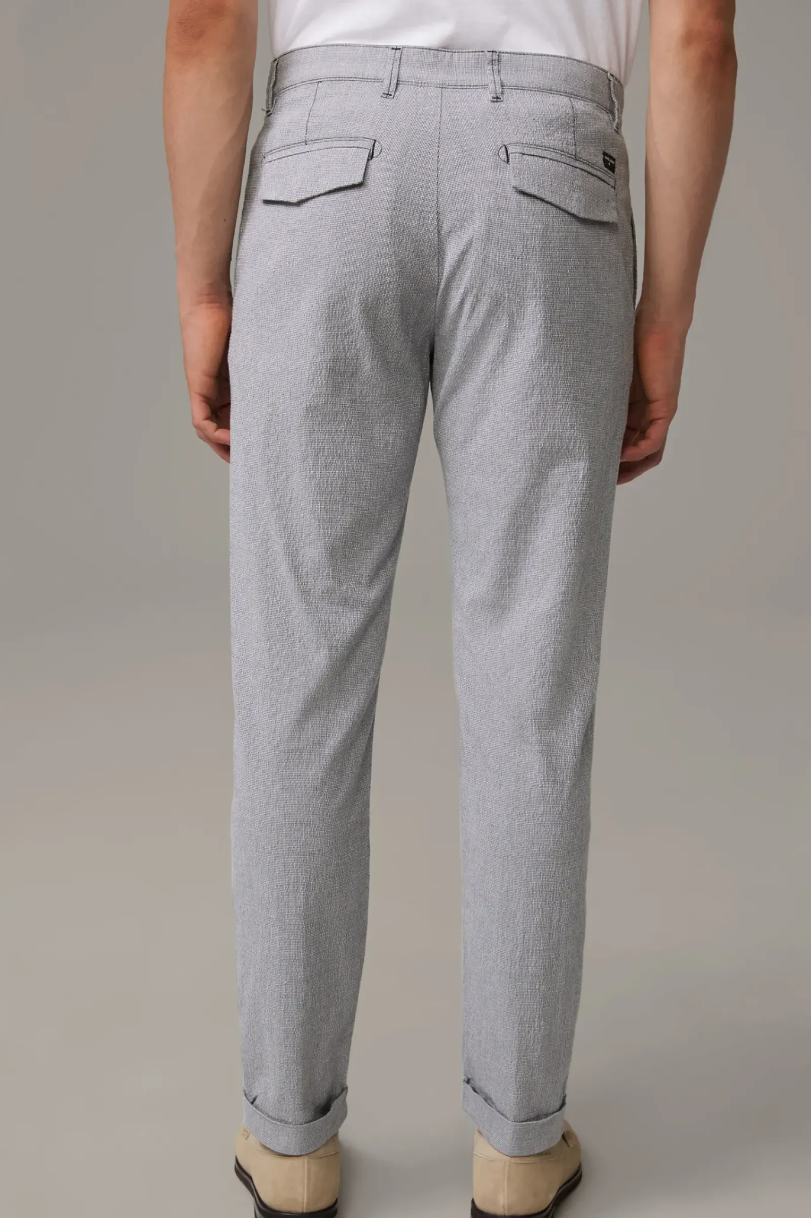 Im strukturierten Minimal-Print mit kontrastiven Nähten überzeugt die Chino Luc mit klassischen Details wie paspelierten Pattengesäßtaschen und fixierten Umschlägen am Hosensaum.