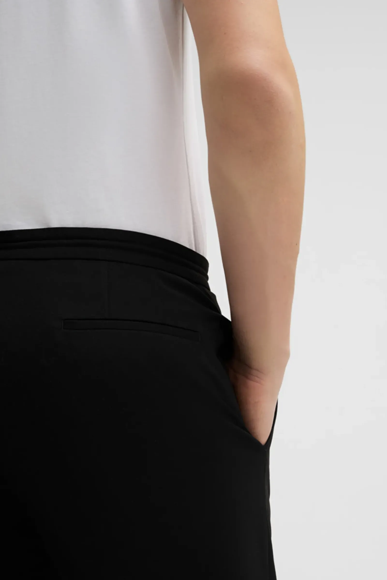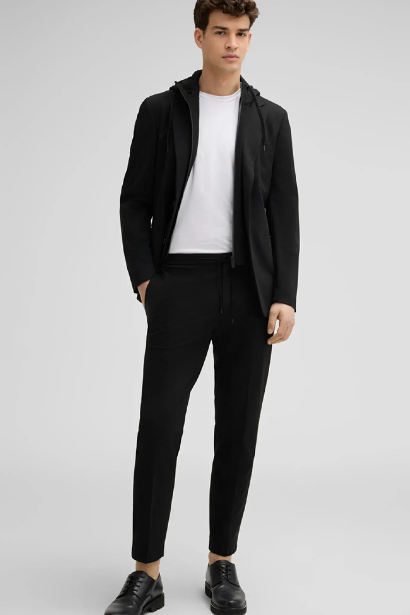 Die Flex Cross Anzughose Saturn überzeugt mit moderner Tech-Qualität, schmaler Silhouette und einem Bund mit lässigem Tunnelzug-Element, ergänzt durch klassische Eingriff- und Gesäßtaschen – passend zum Sakko Arndt.