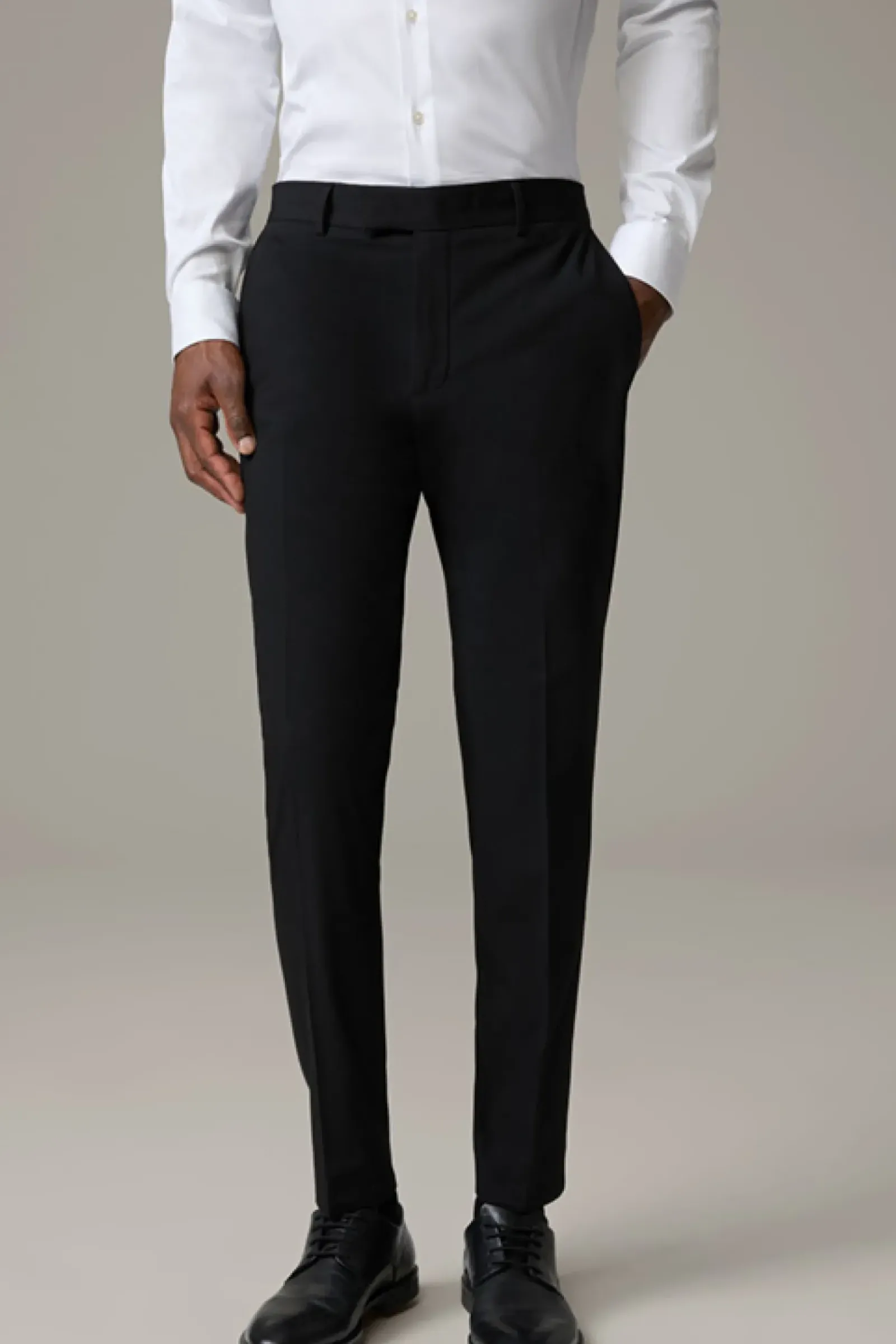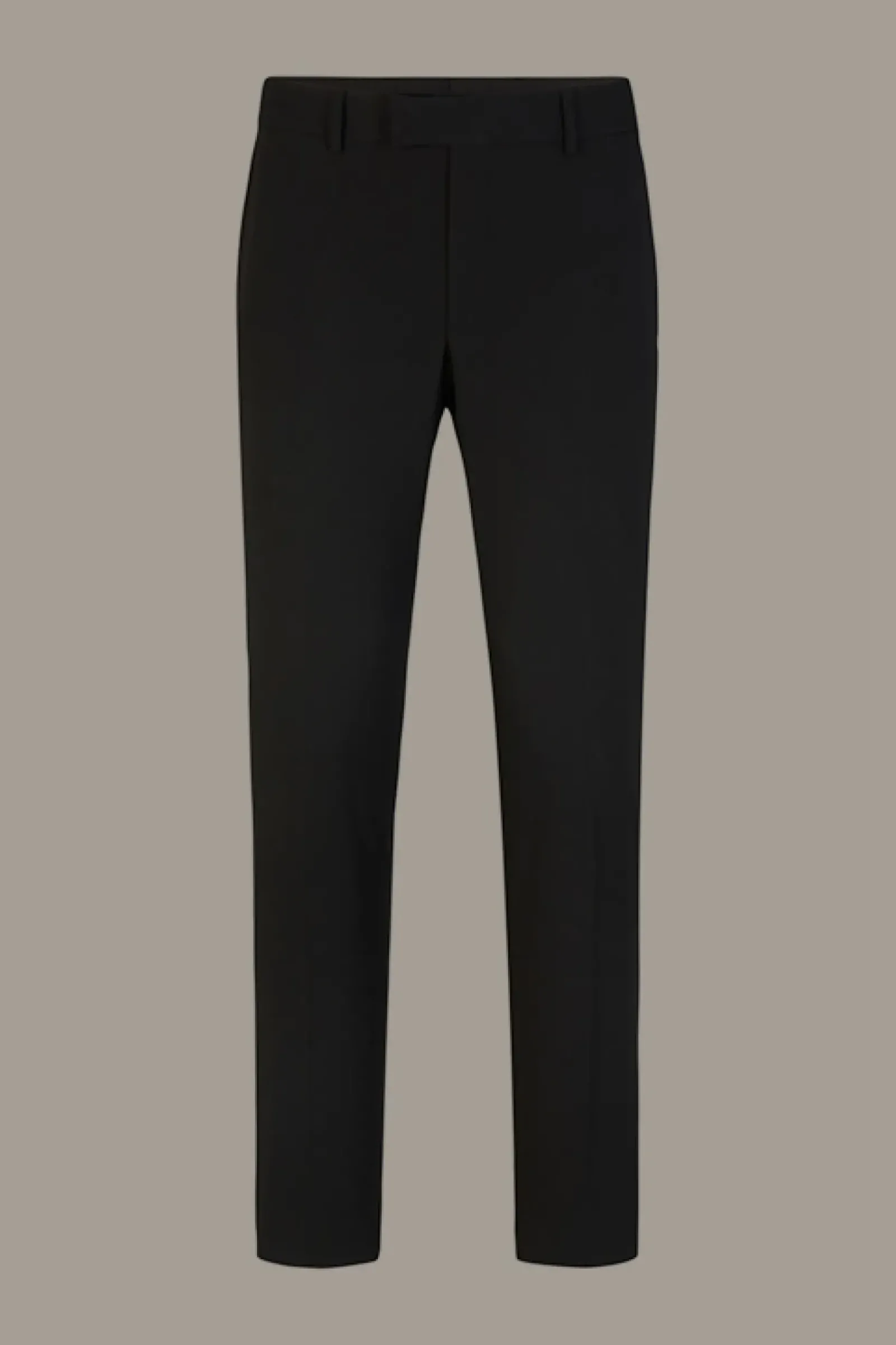 Ein Doppelhaken und Leistengesäßtaschen zeichnen die Anzughose Melwin aus. Mit klassischen Bügelfalten und glattem Kniefutter.