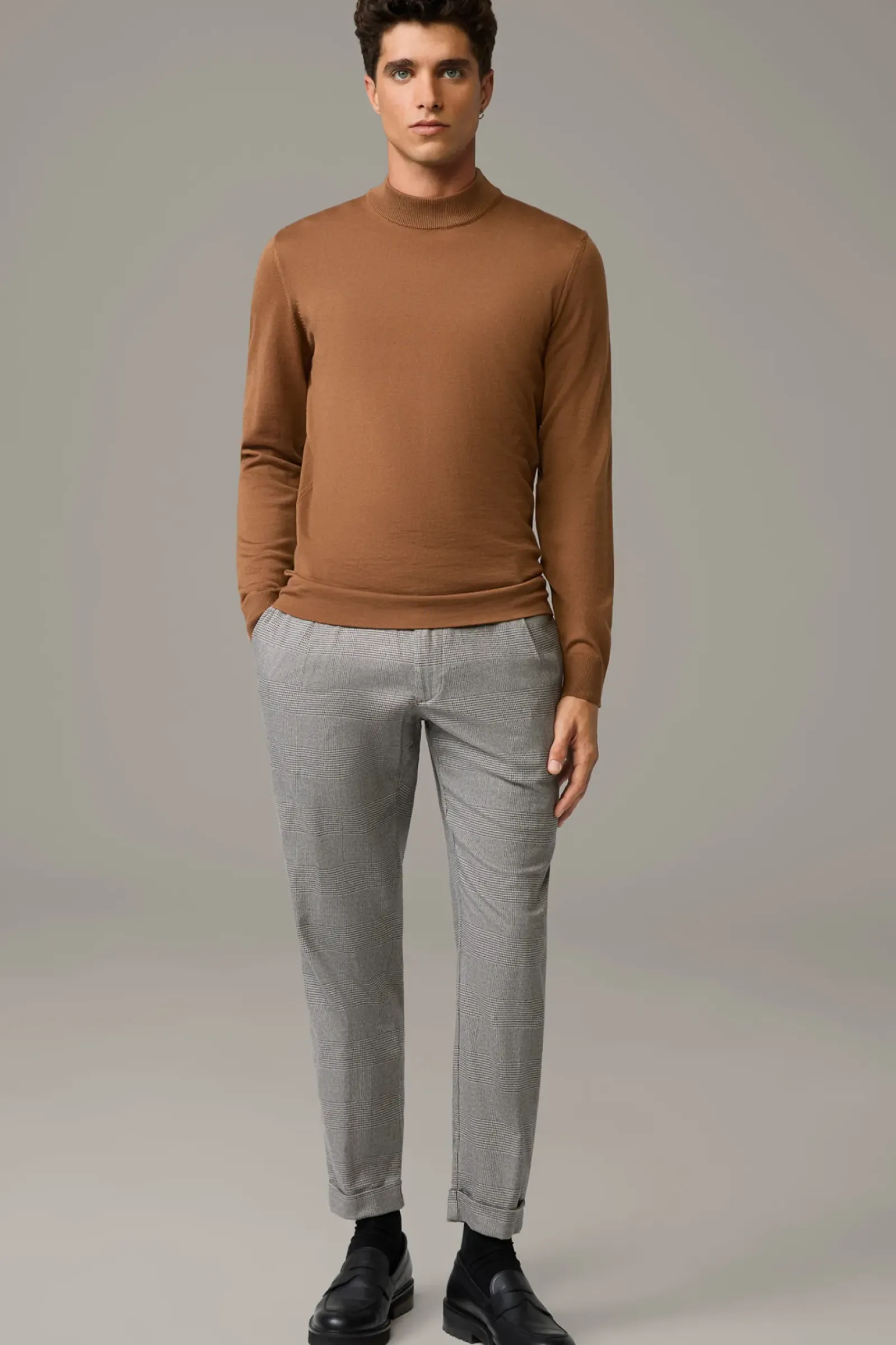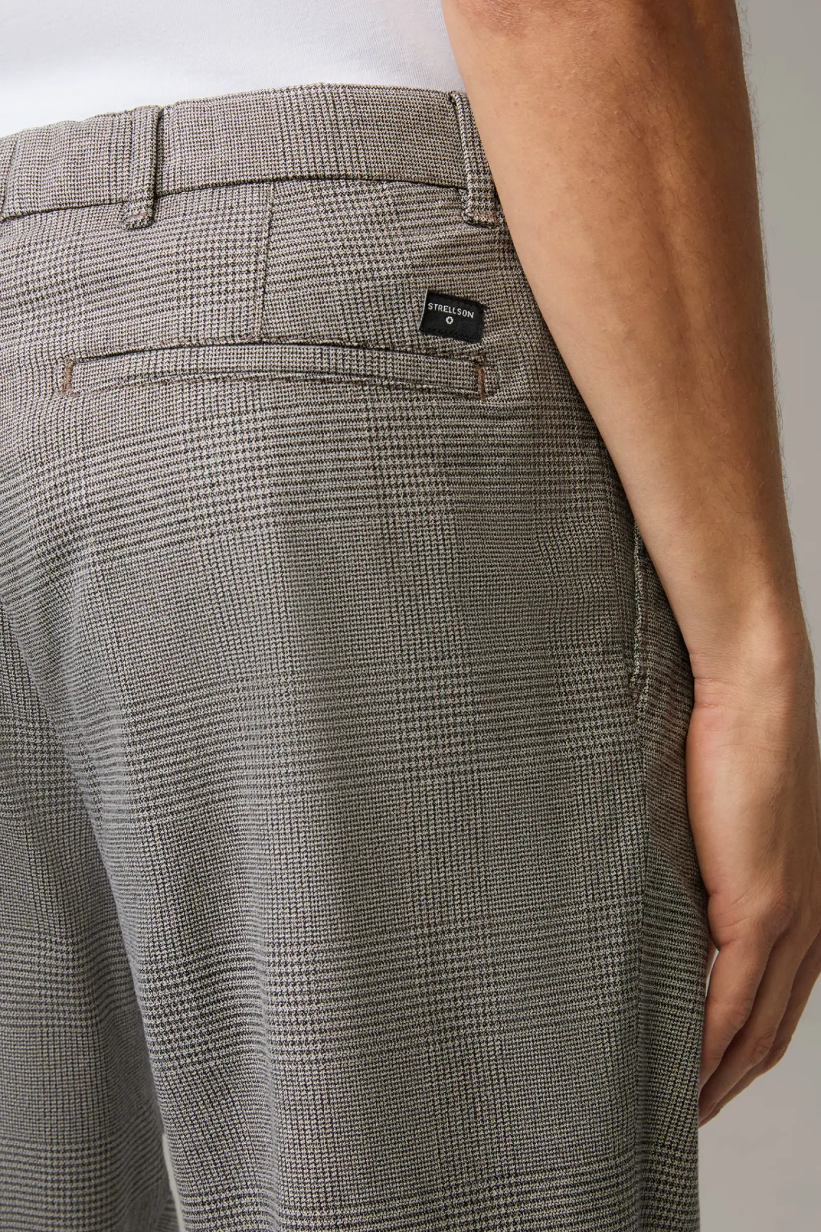 Casual Smart: die Bundfaltenhose Louis aus Cotton-Stretch im Glencheck Look. Die verkürzte Hosensilhouette, der Karabiner mit Logo-Band und fixierte Saumumschläge ergänzen das urbane Design.