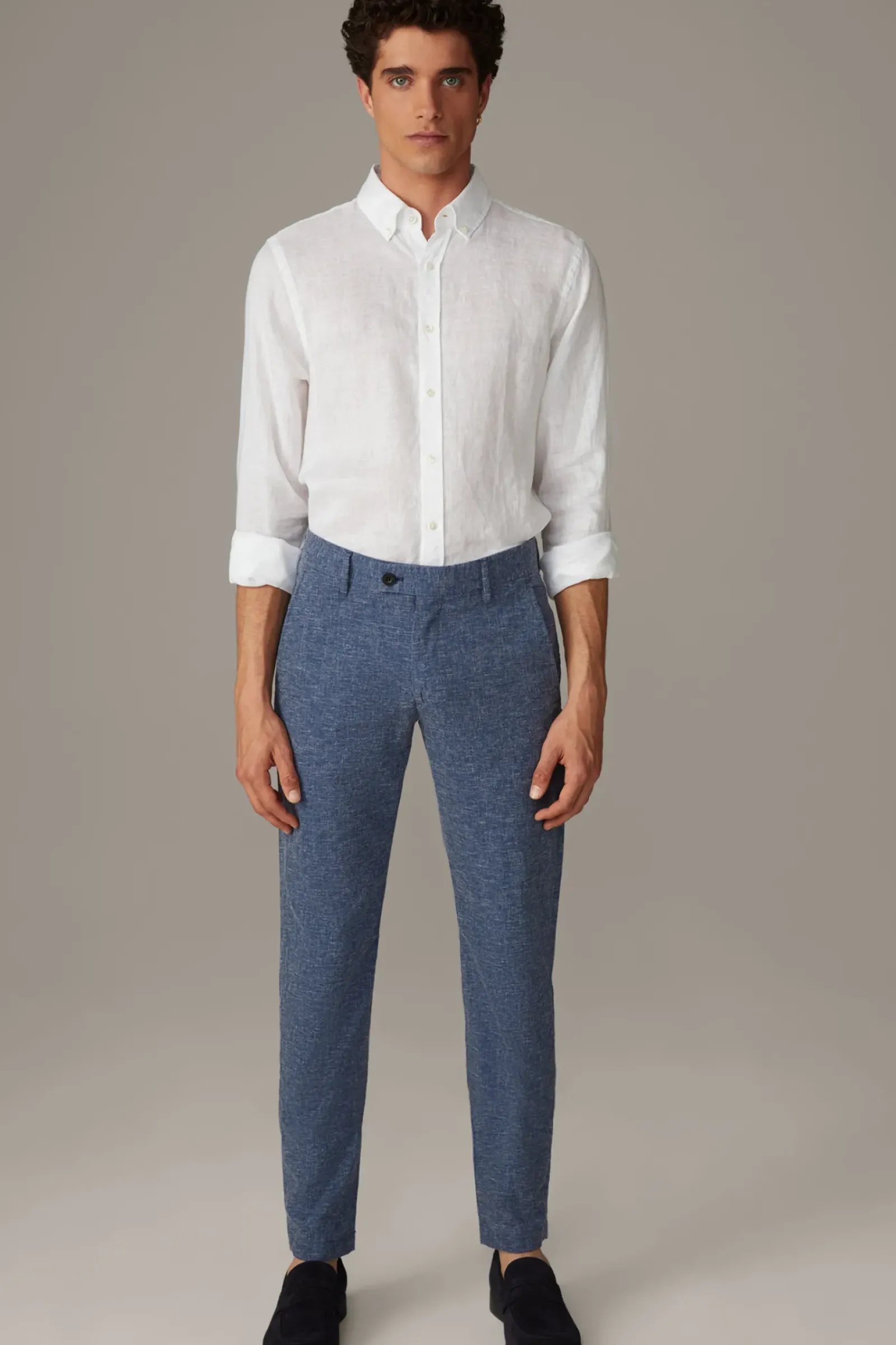 Typisches Flex Cross Piece: Chino Code aus leichtem Leinen-Viskose-Blend in schmaler Passform mit versetzter Knopfschließe, abgeschrägten Seiten- und knöpfbaren Gesäßtaschen.