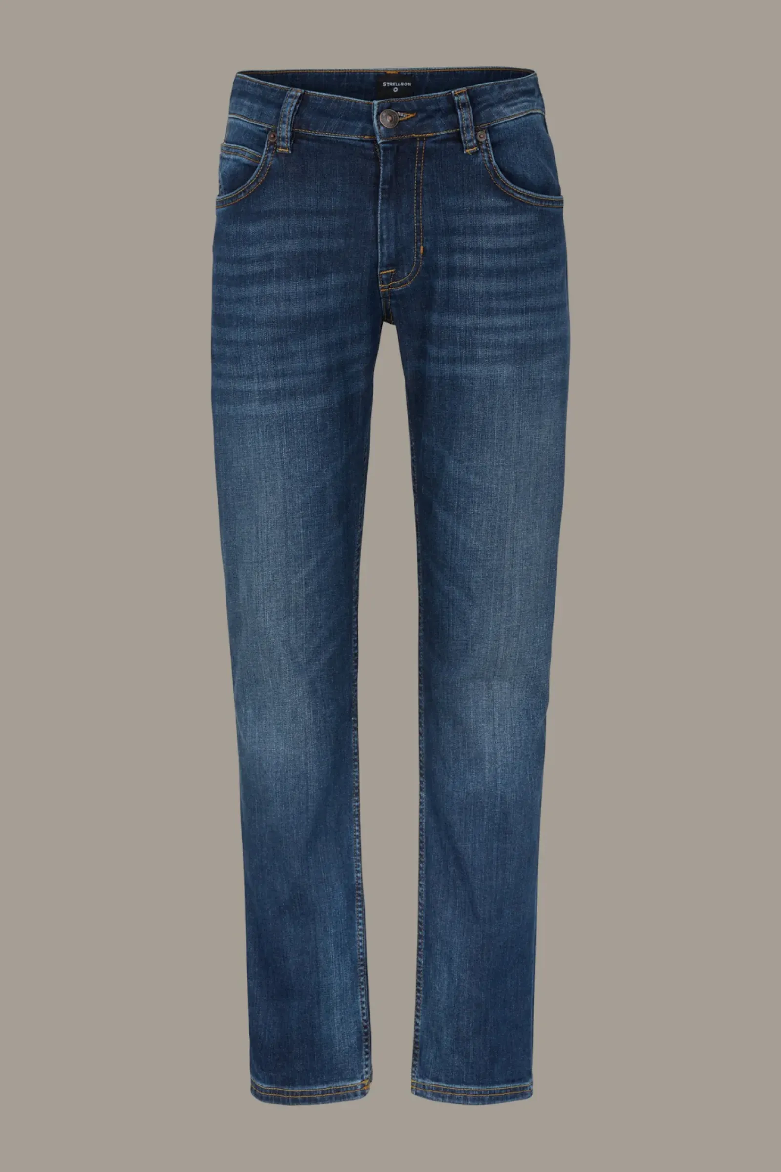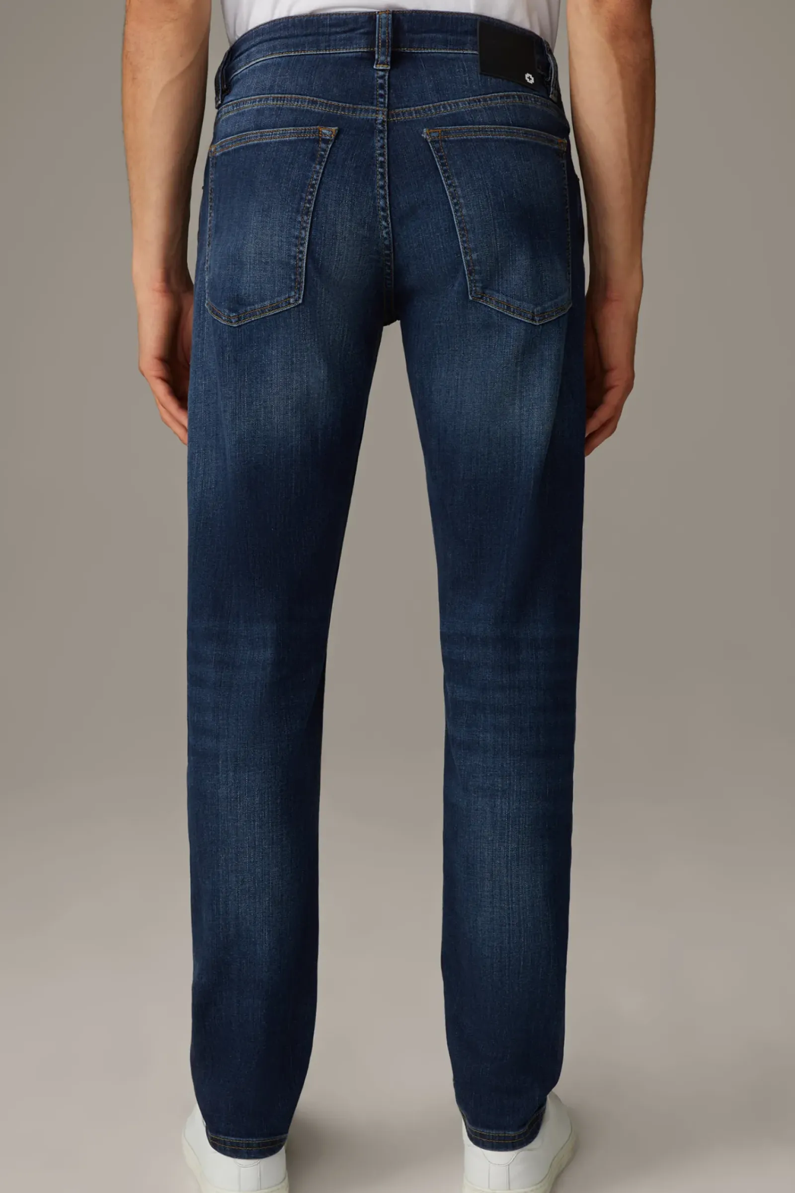Essential für Daily-Looks: die schmal geschnittene Five-Pocket-Jeans Robin in performancestarker Flex-Cross-Qualität. Kontrastnähte, die Used-Waschung mit Moustache-Falten und Logo-Details prägen das Design.