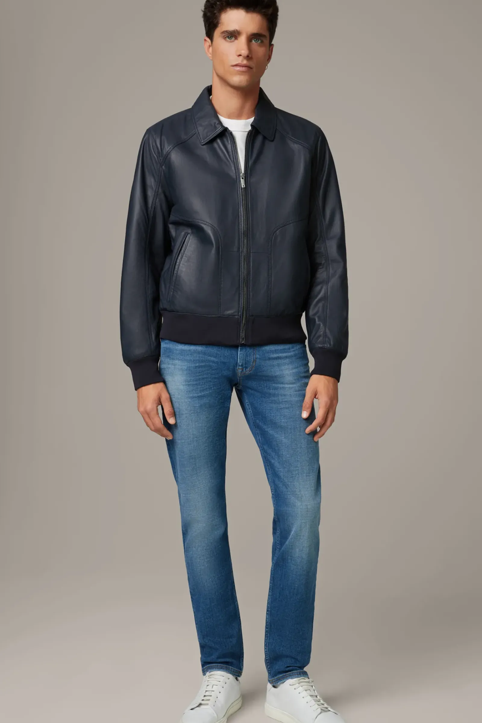 Im Blouson-Design matcht die Lederjacke Briods zu jedem Outfit. Lässige Ziernähte, Rippstrickbündchen und ein Logo-Zipper verleihen Signature Flair.