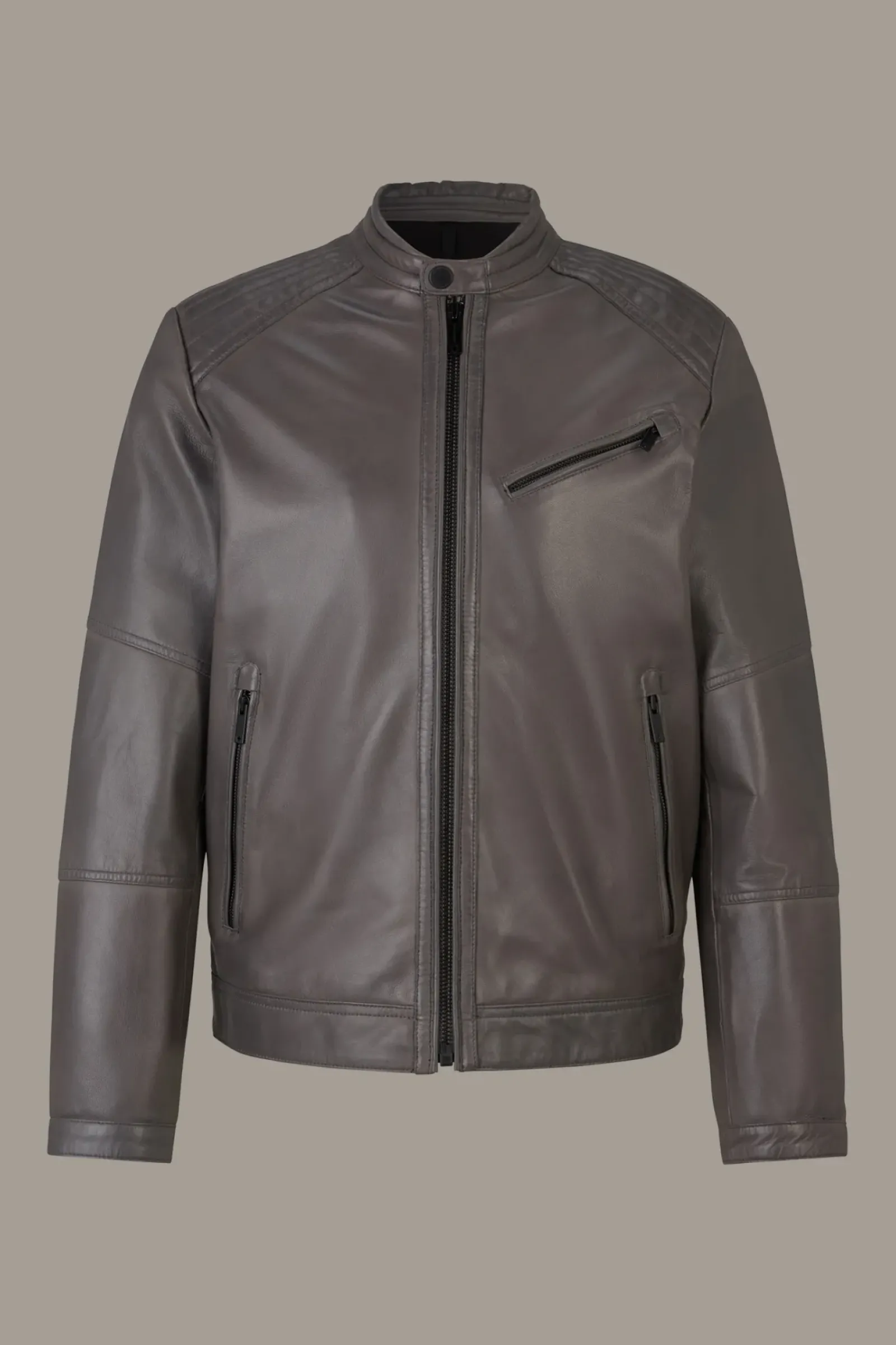 Cooles Item im Bikerstil: die Lederjacke Wells mit knöpfbarem Stehkragen, Zippertaschen und gesteppter Schulterpartie. Aus reinem Lammnappa, vollgefüttert.