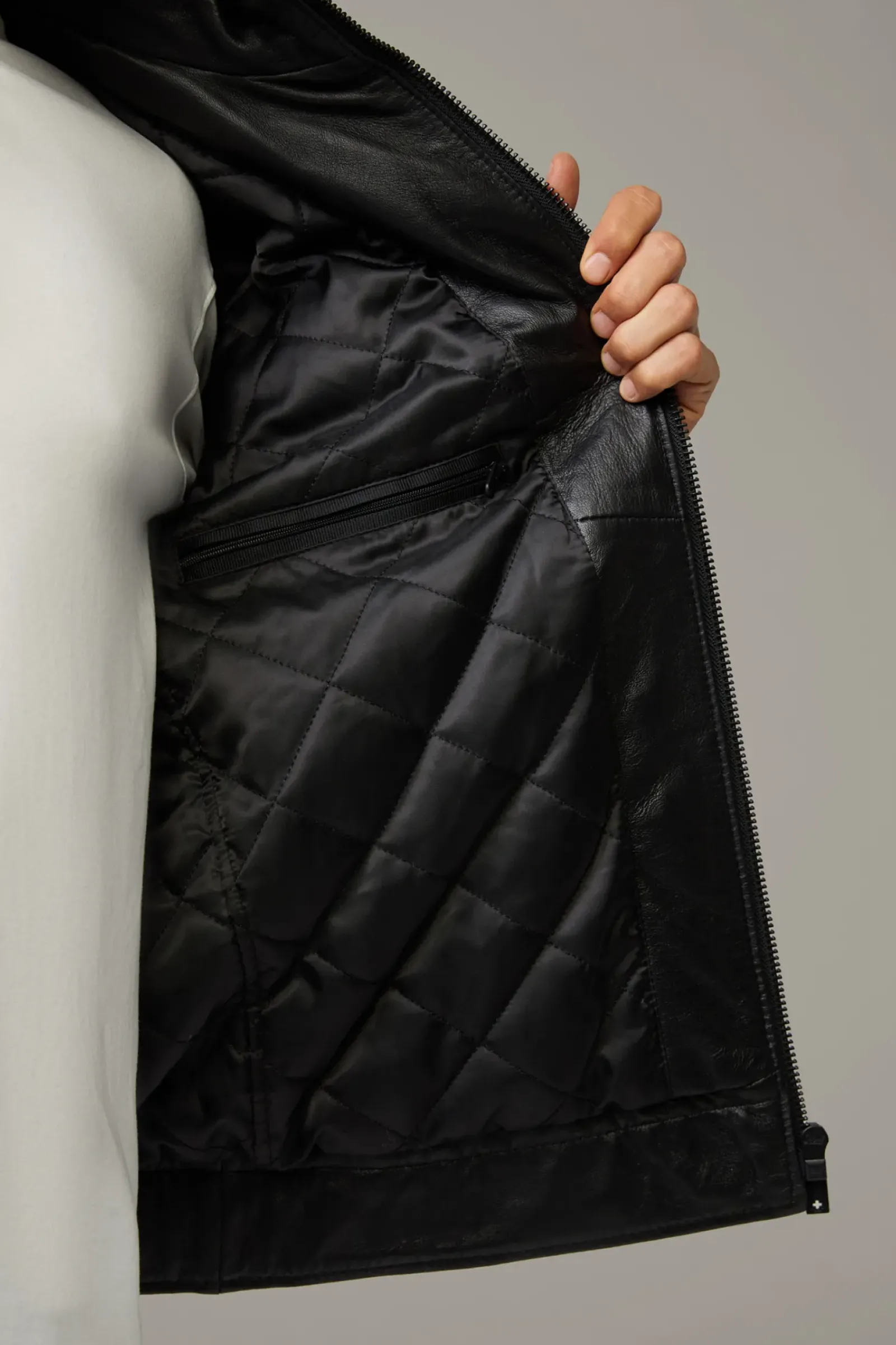 Cooles Piece im Bikerstil: die Lederjacke Preston aus reinem Lammnappaleder. Ein Stehkragen, der Saum mit knöpfbaren Riegeln und formgebende Teilungsnähte ergänzen den Look.