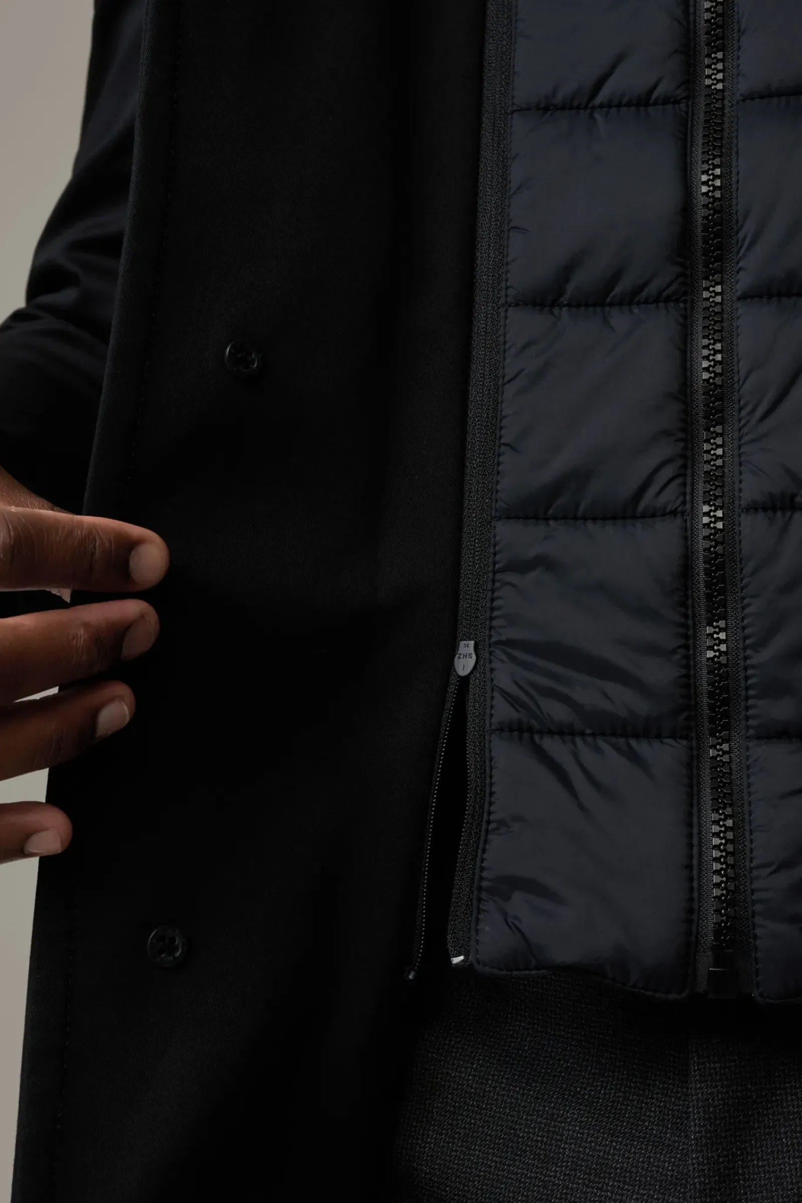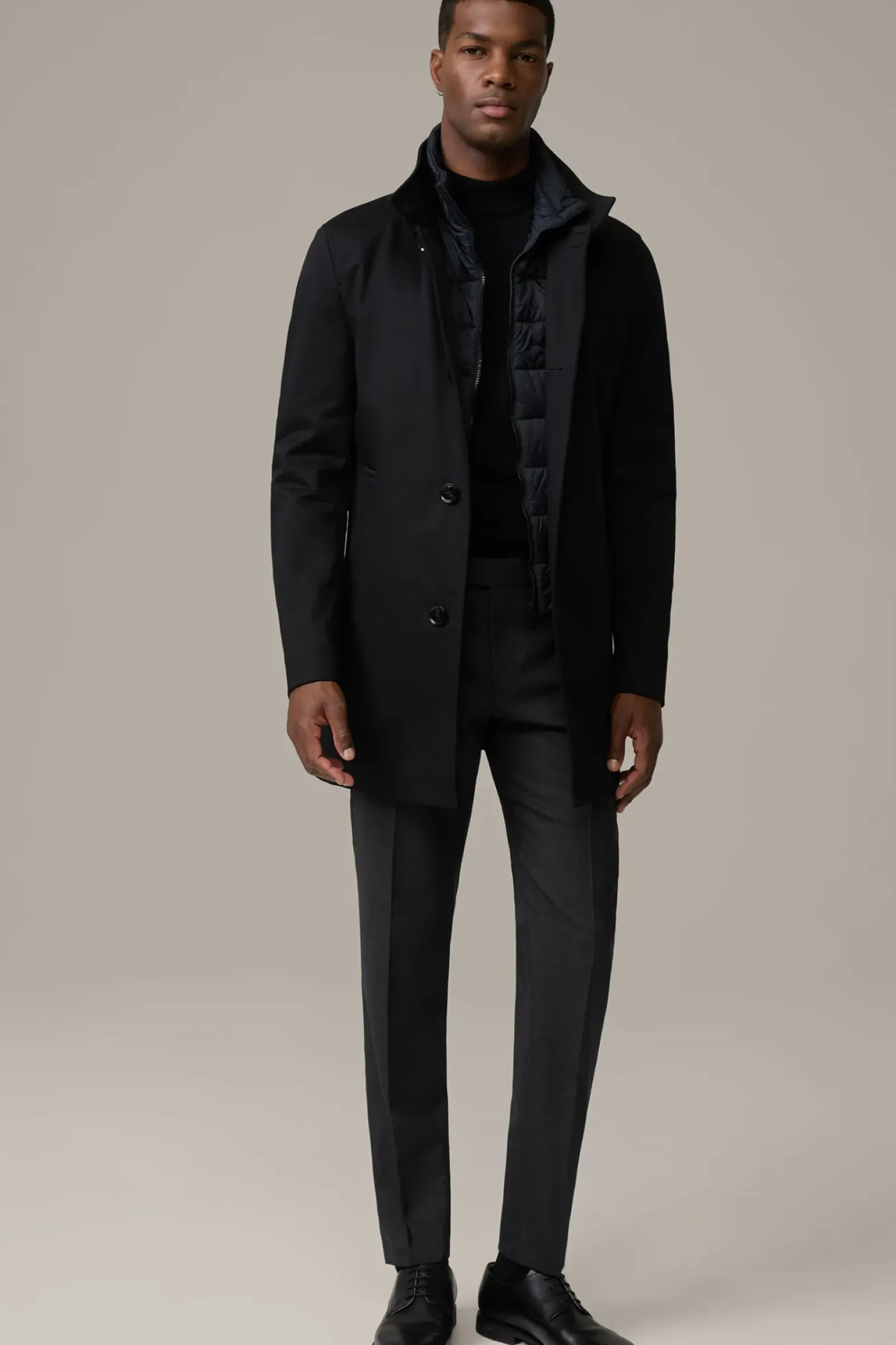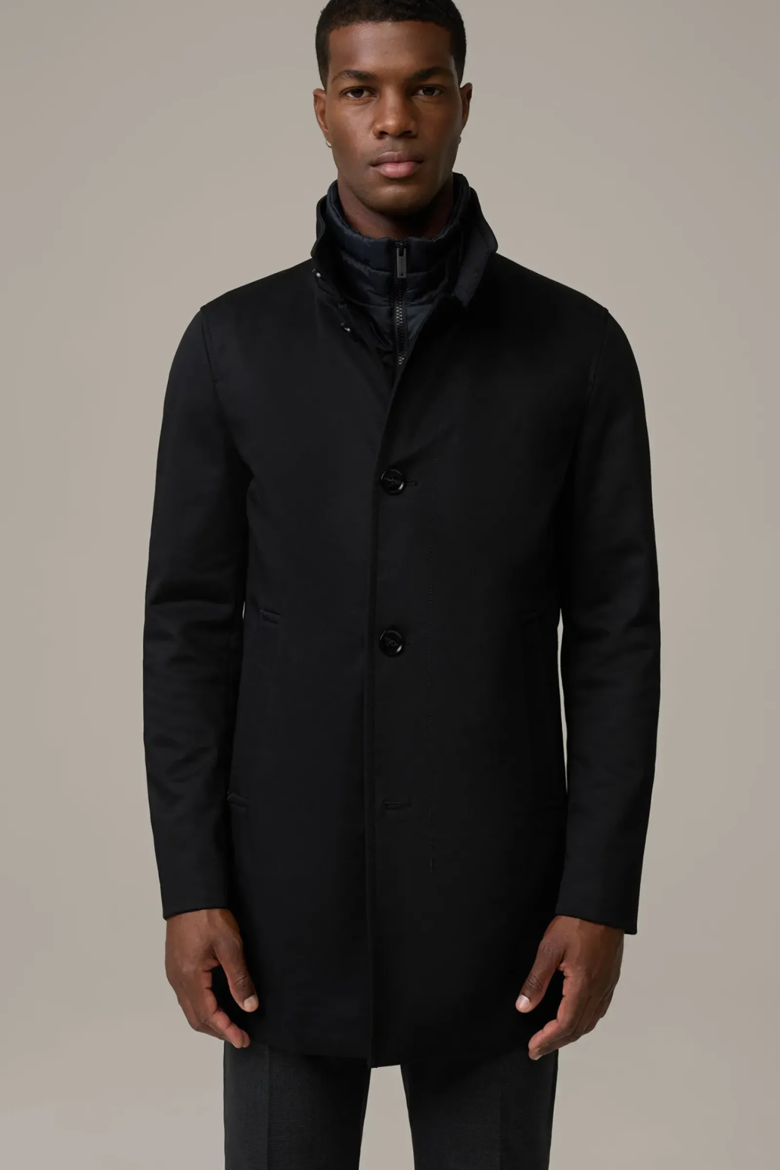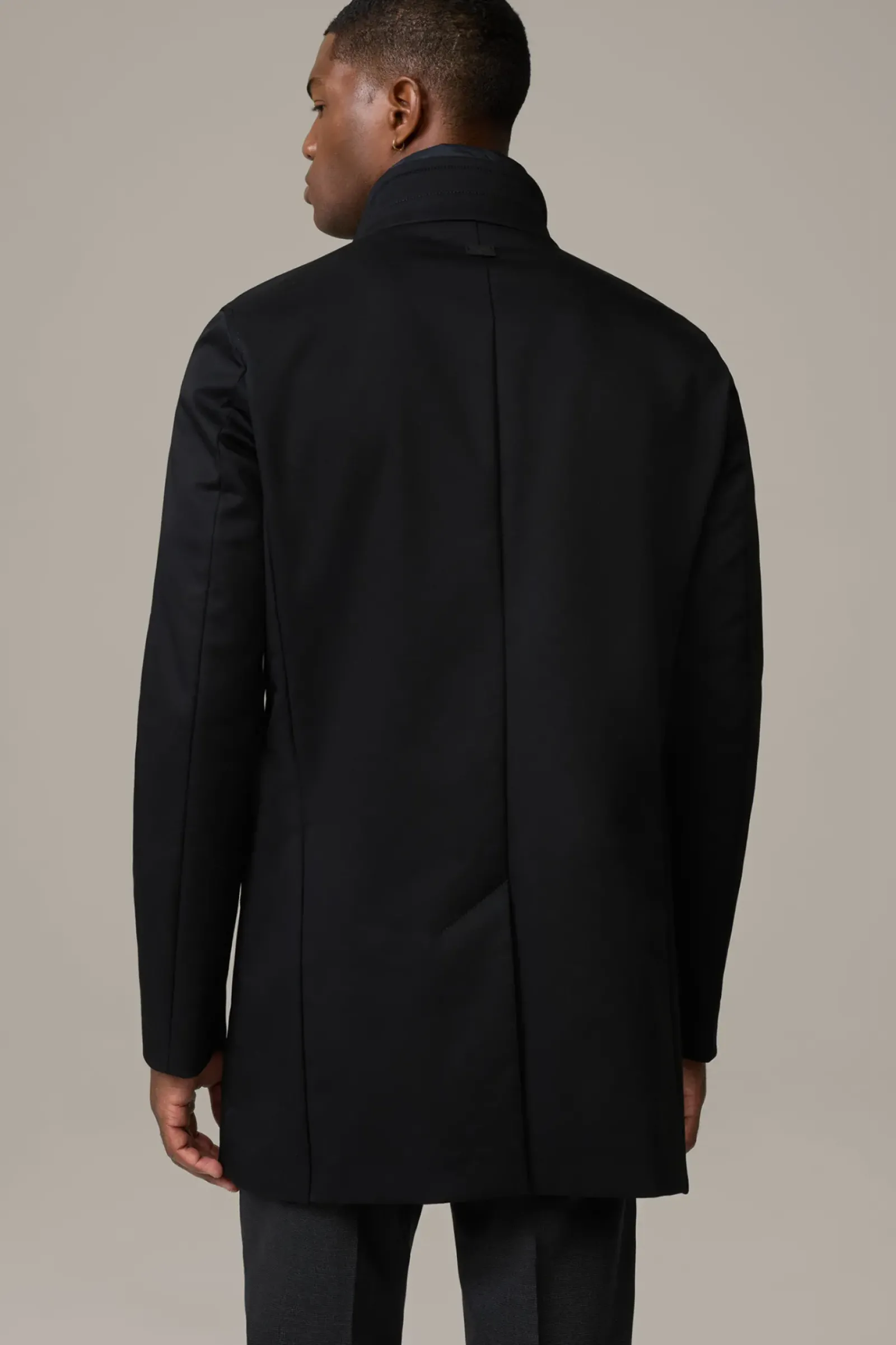 Begeistert als moderner Einreiher mit Stehkragen und abzippbarem Stepp-Inlay. Perforiertes Teilfutter und Bewegungsschlitz sorgen für Komfort.