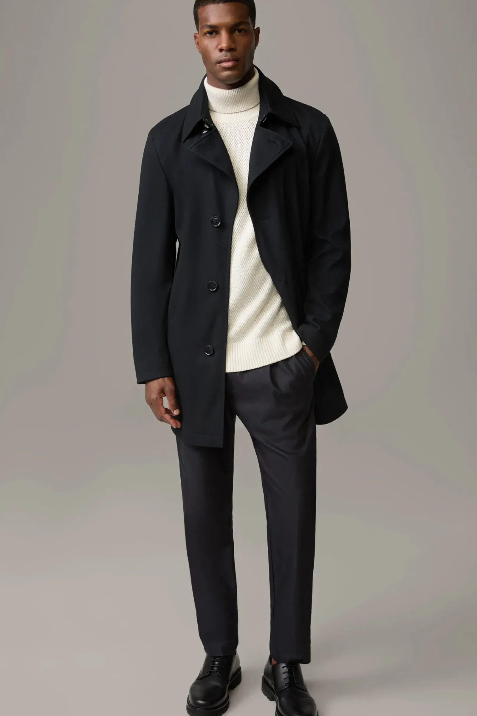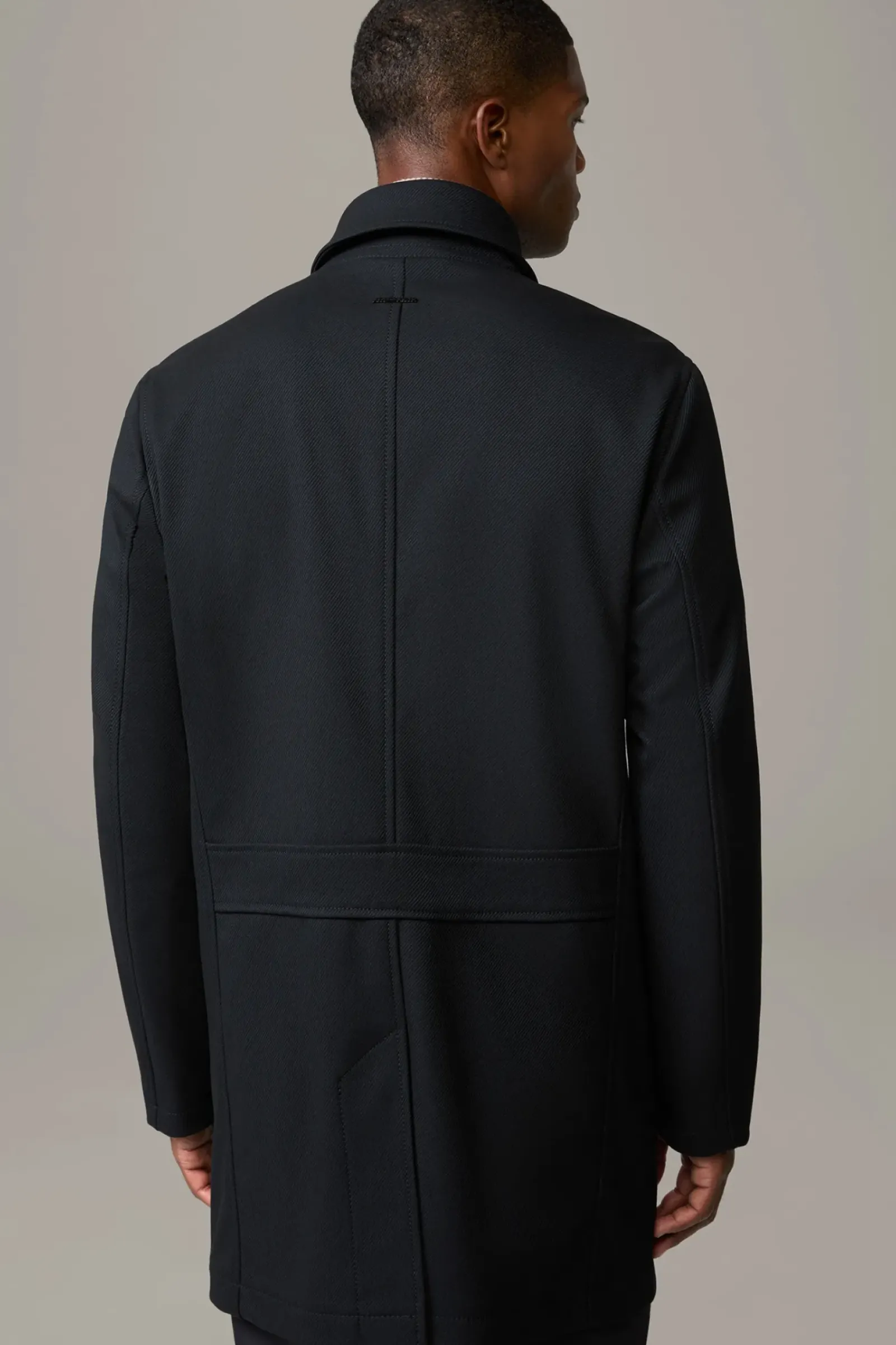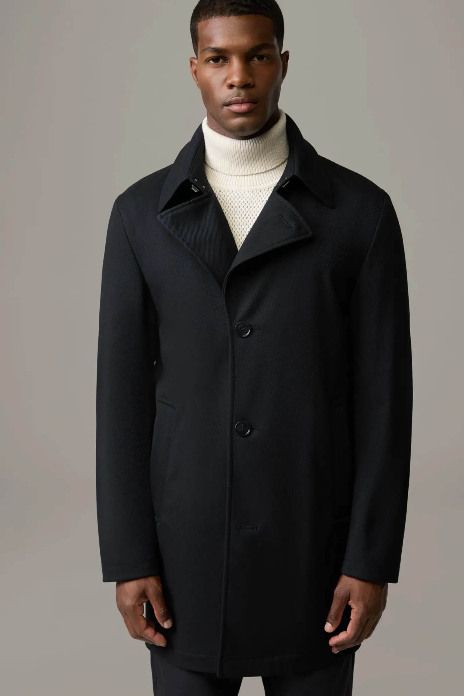 Allrounder mit Classic Twist: der Kurzmantel Adem aus technischer Viskose im Struktur-Design mit Trenchkragen, Leistentaschen und Knopfleiste. Für Komfort sorgt der Bewegungsschlitz.