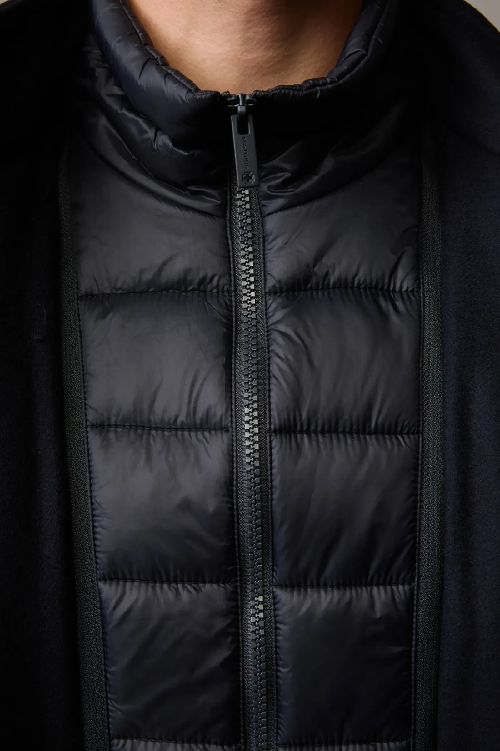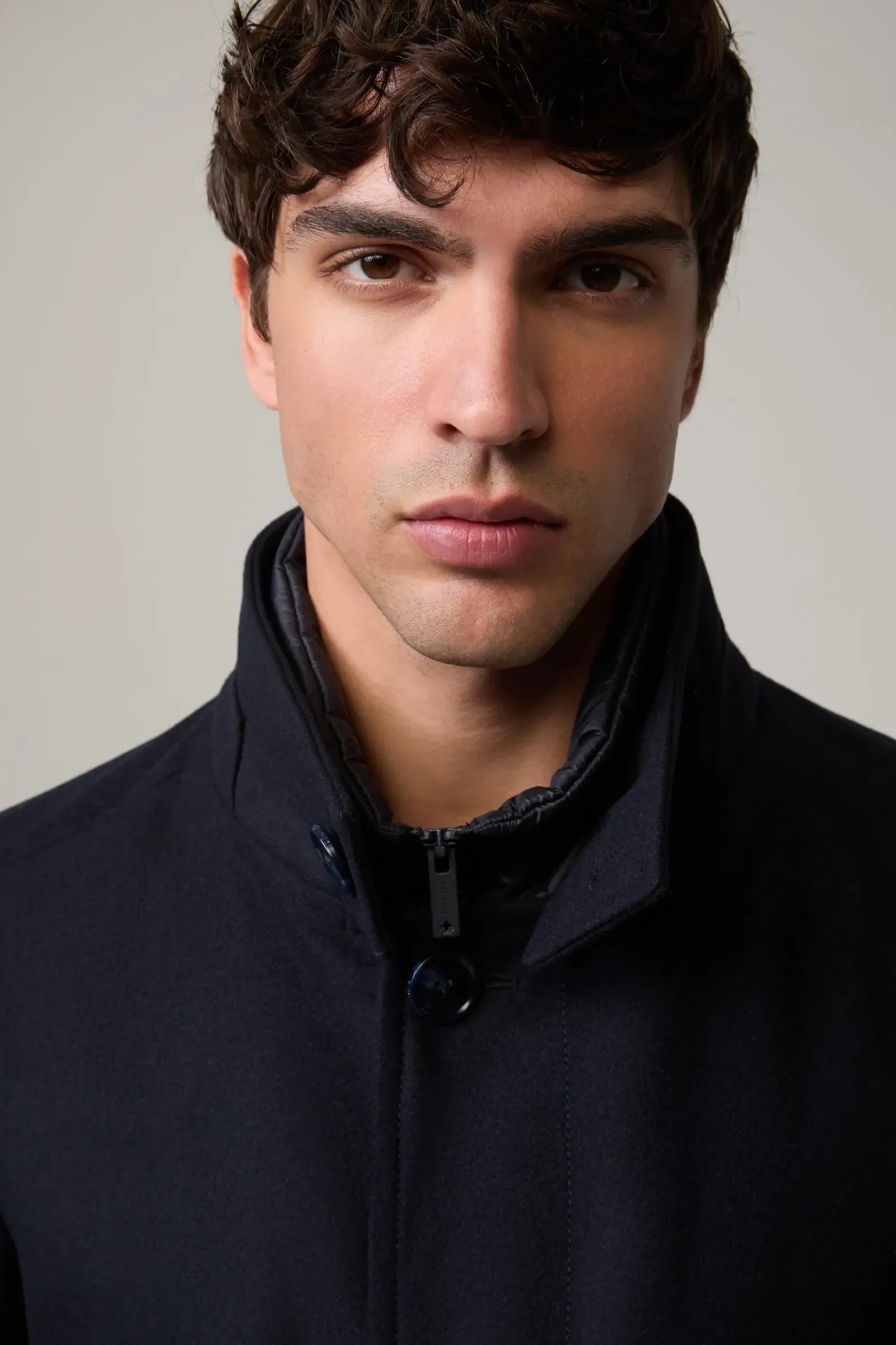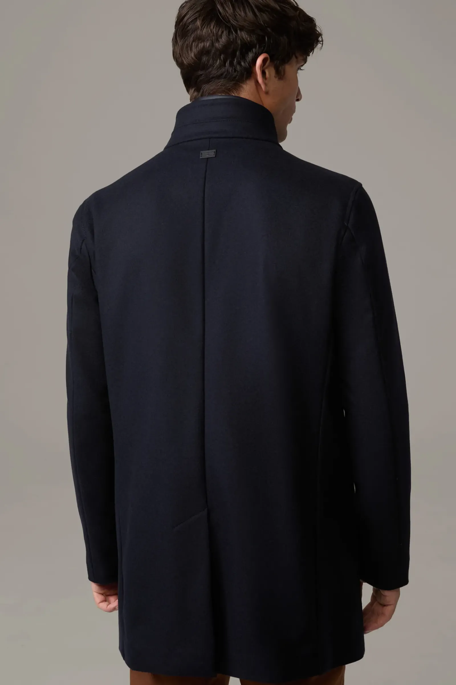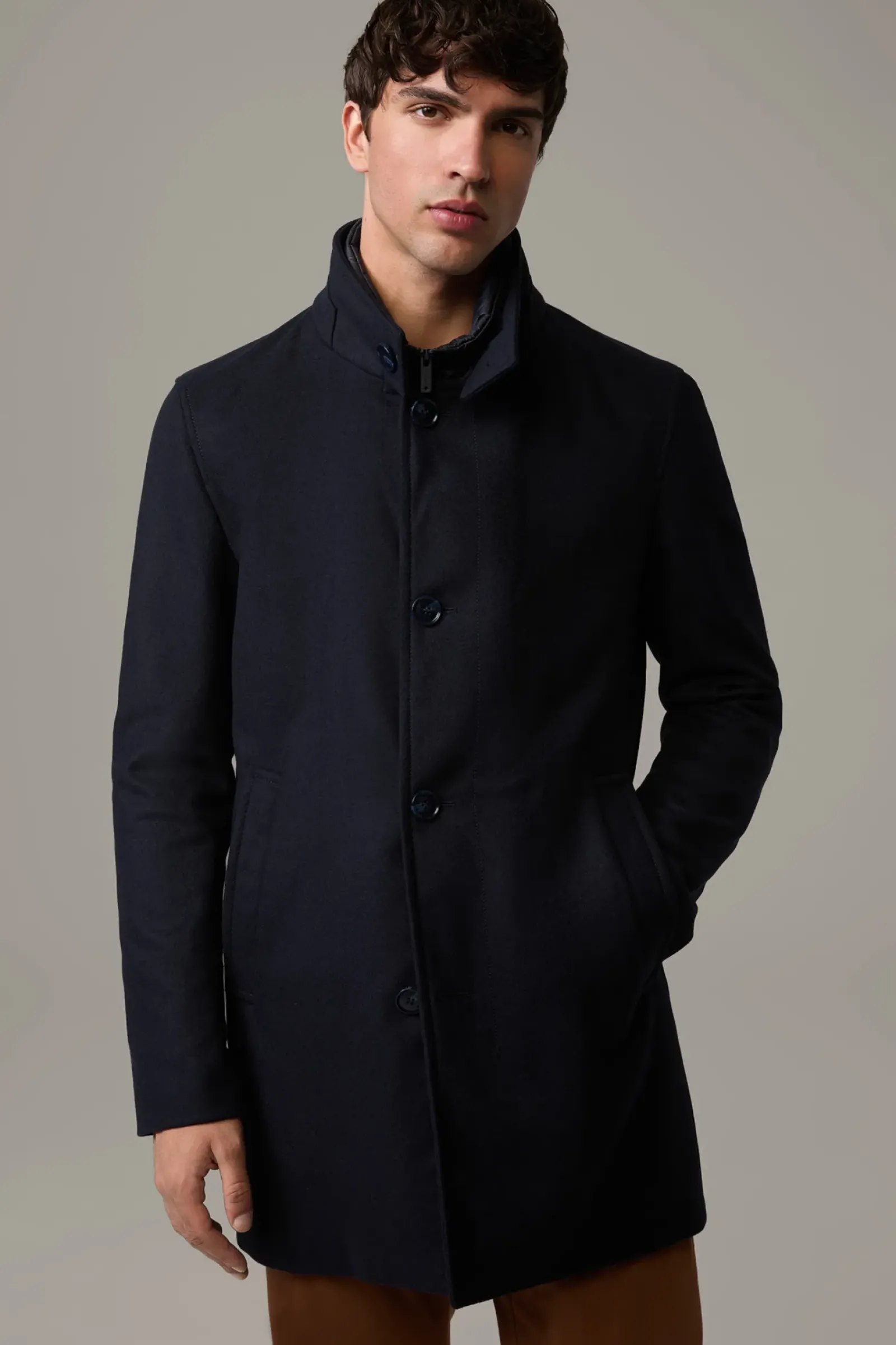 Klassischer Einreiher mit Stehkragen und abzippbarem Stepp-Inlay: der Mantel Finlay im Wollmix mit Cashmere-Anteil. Teilgefüttert.