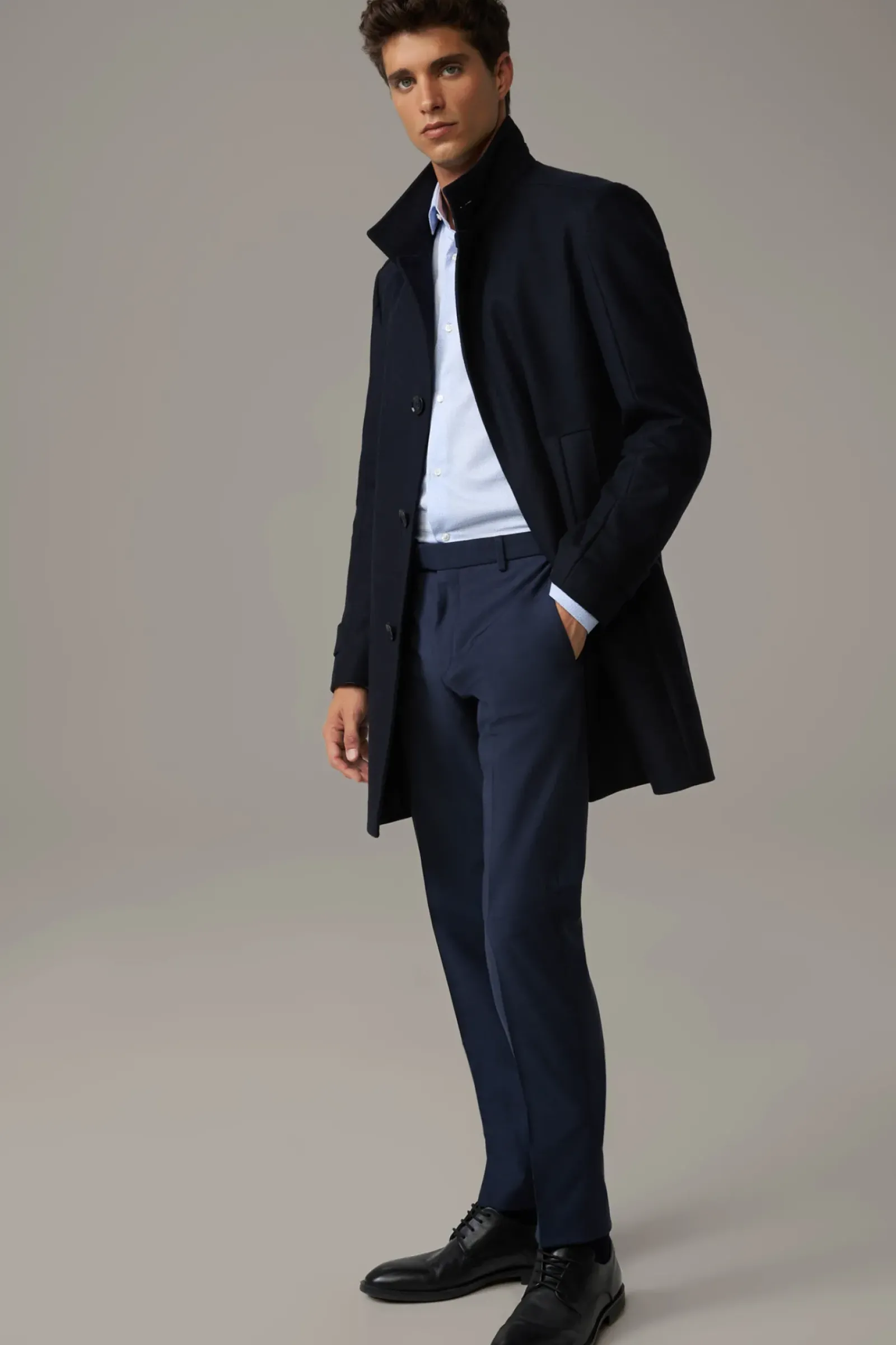 Klassisches Piece: der Mantel New Broadway im edlen Wollmix mit Cashmere und fließendem Futter. Stehkragen, Ärmelabschlüsse mit Riegeldetail, Leistentaschen setzen Akzente.