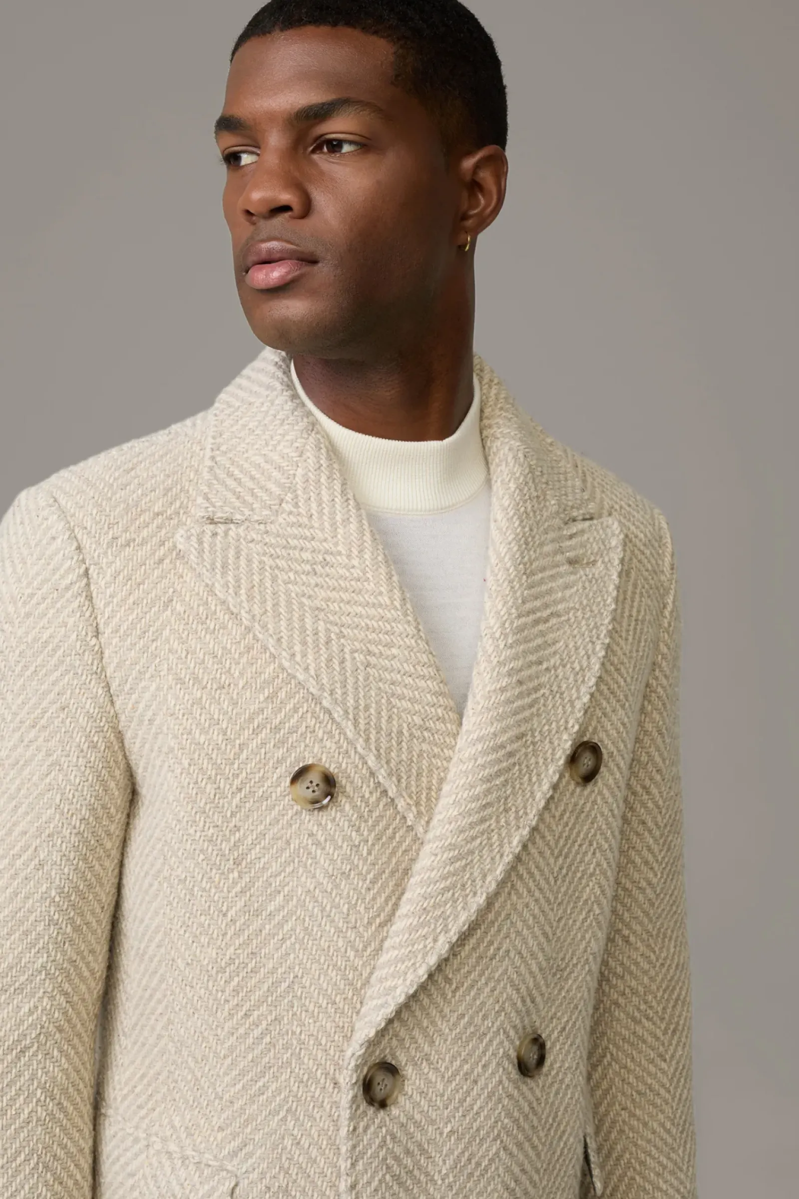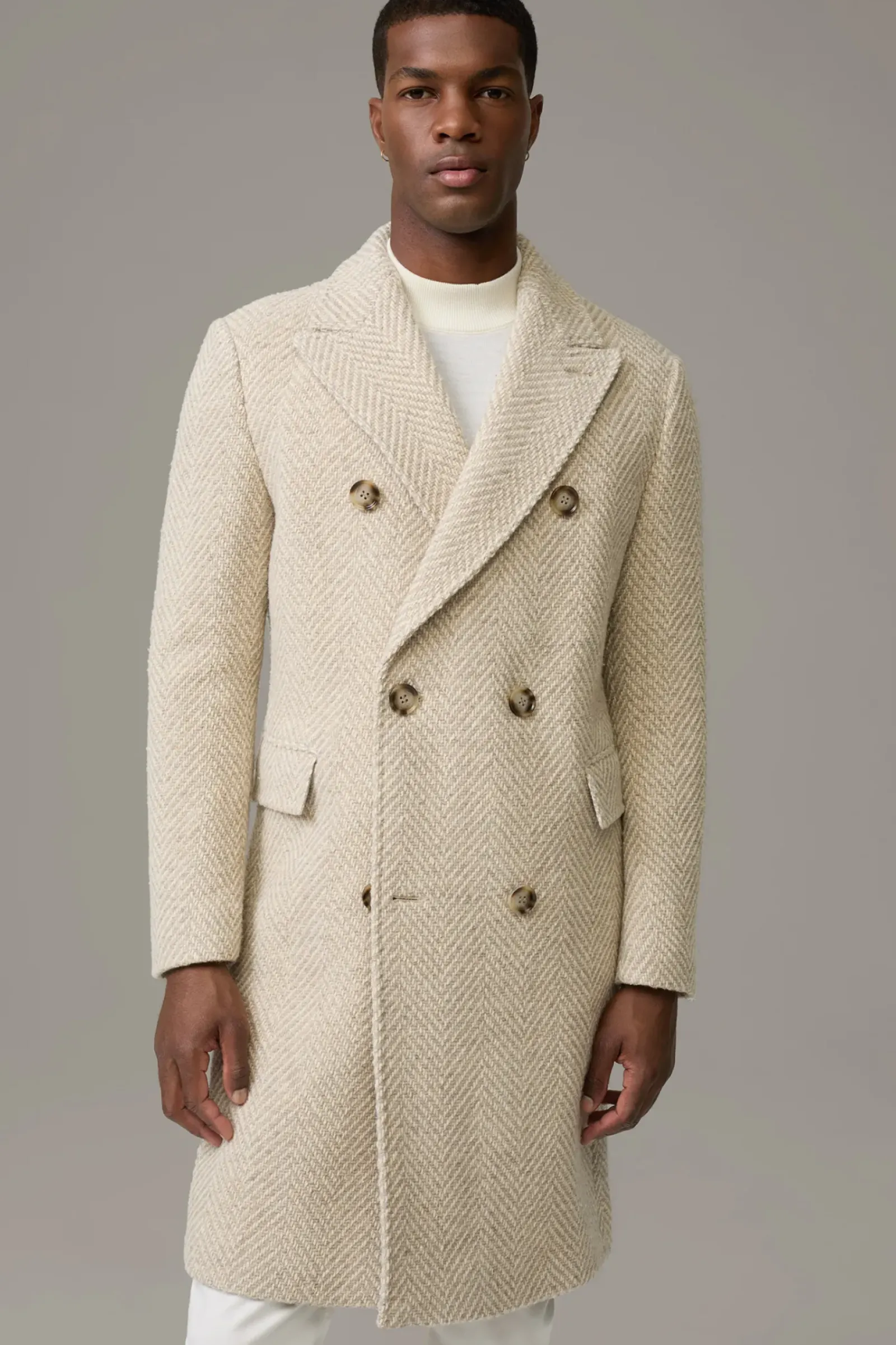 Komfortables Piece: der Wollmix-Mantel Park Lane in Strick-Verarbeitung. Doppelreihig mit Pattentaschen, Reverskragen und Bewegungsschlitz. Italienische Weberei Nova Fides.