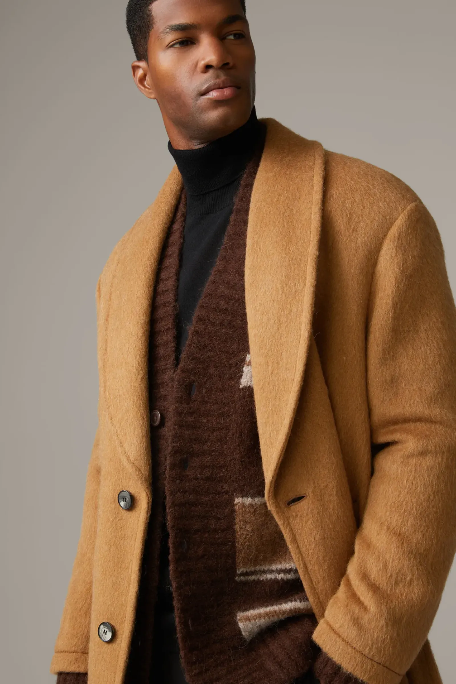 Zeitloses Styling-Piece: der Mantel Scarfcoat mit Schalkragen, Taillengürtel und langem Bewegungsschlitz. Der Wool-Mix zeichnet das Look-and-Feel aus, ergänzt durch kontrastive Logo-Knöpfe für das labeltypische Finish.