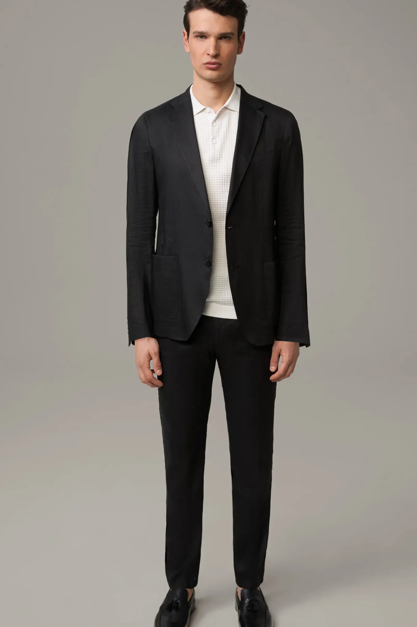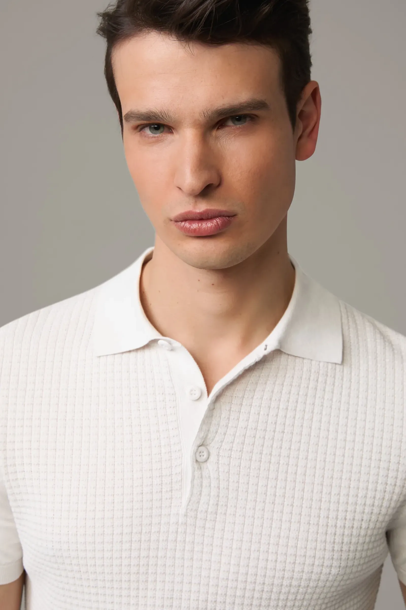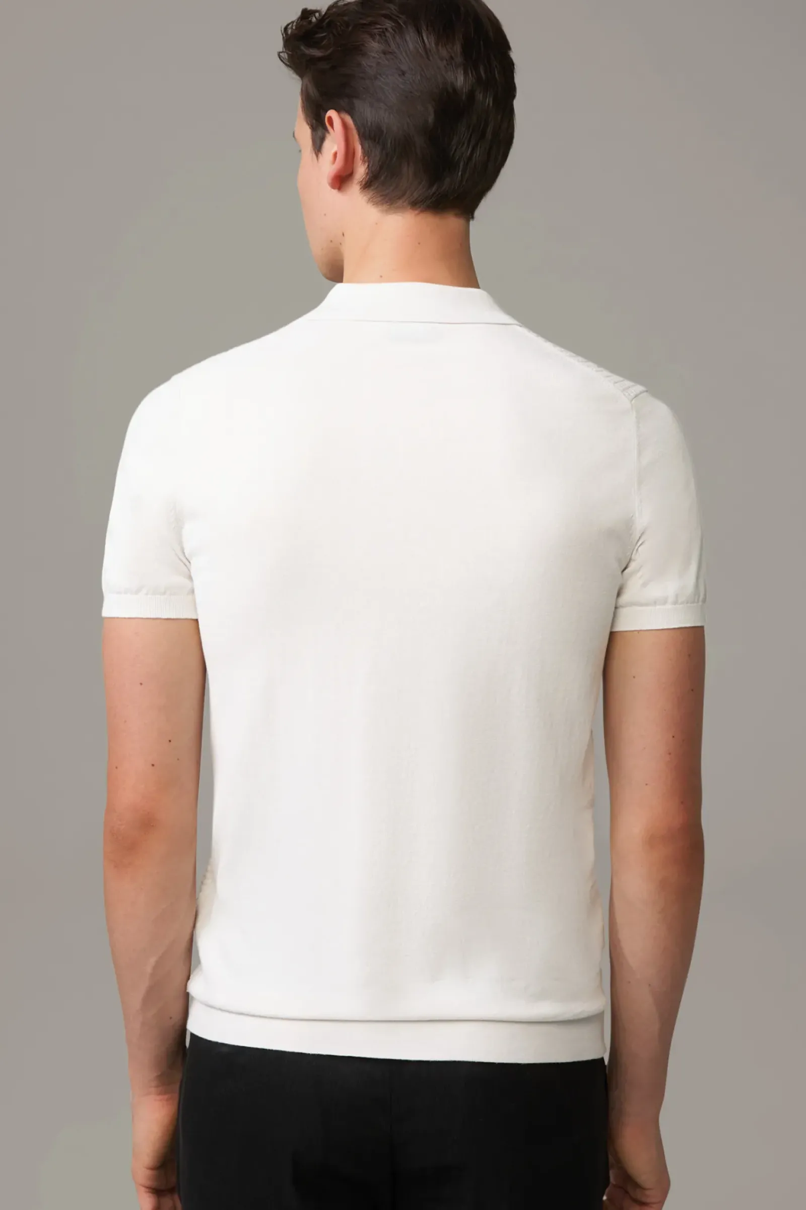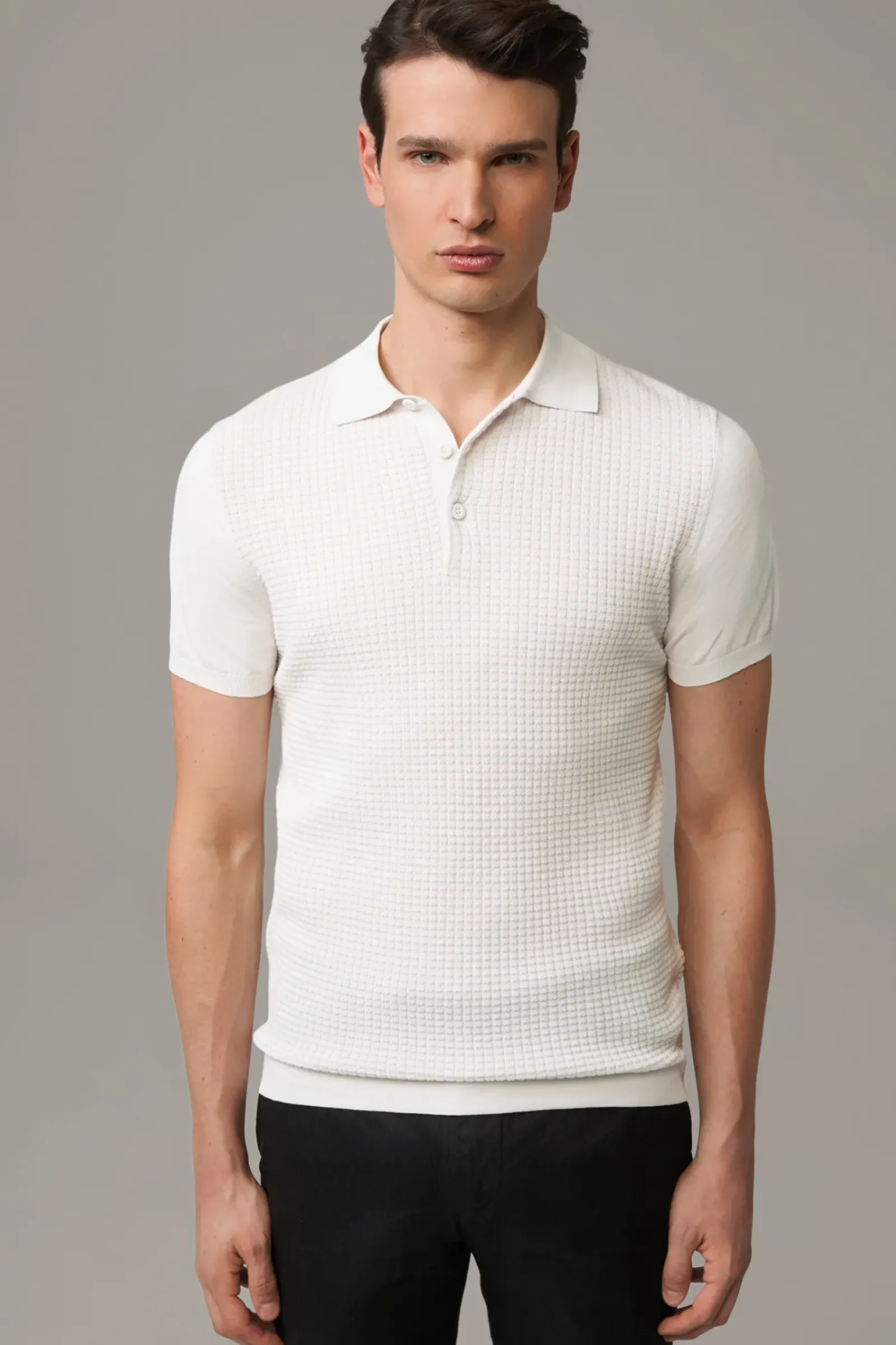 Das Poloshirt Vincent im modernen Mix aus glattem Strick und Strukturmuster. Monochrome Knöpfe und der klassische Kragen ergänzen das Piece.