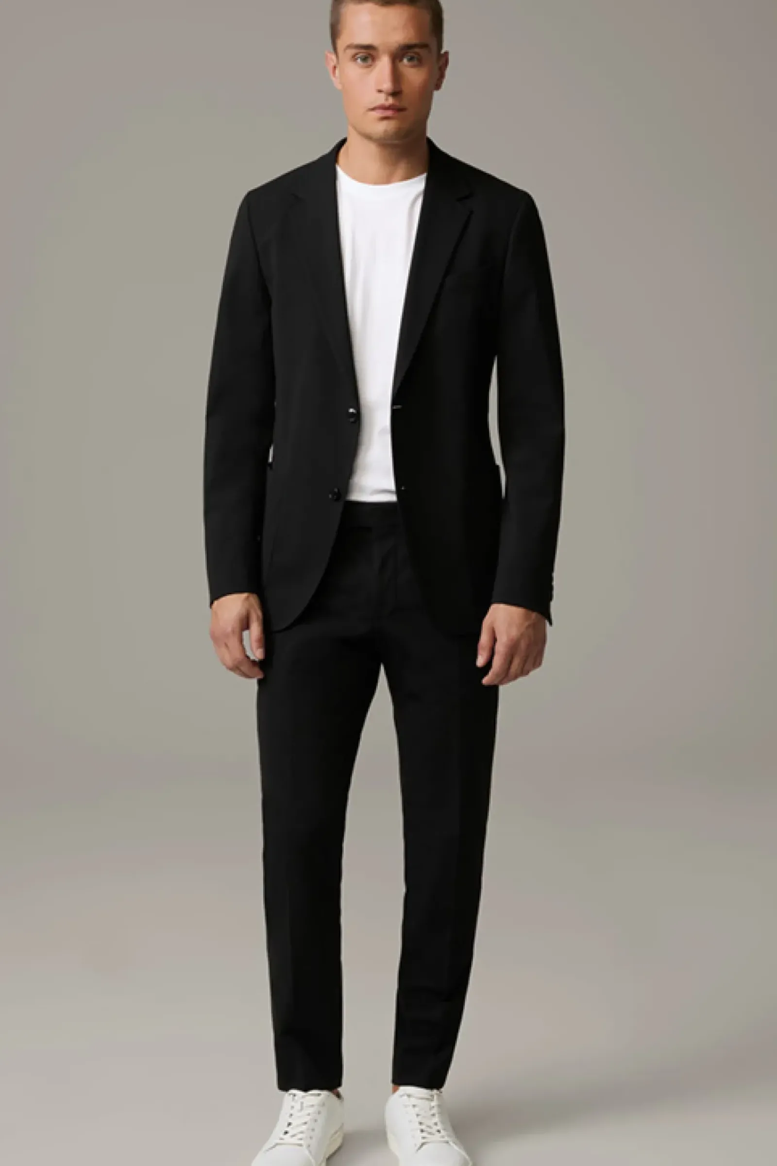 Die luxuriöse Jersey-Stretch-Qualität zeichnet das Sakko Arndt der Serie Flex Cross als variables Dresscode-Essential aus, akzentuiert mit modernen Eingrifftaschen – passend zur schmalenHose Saturn.