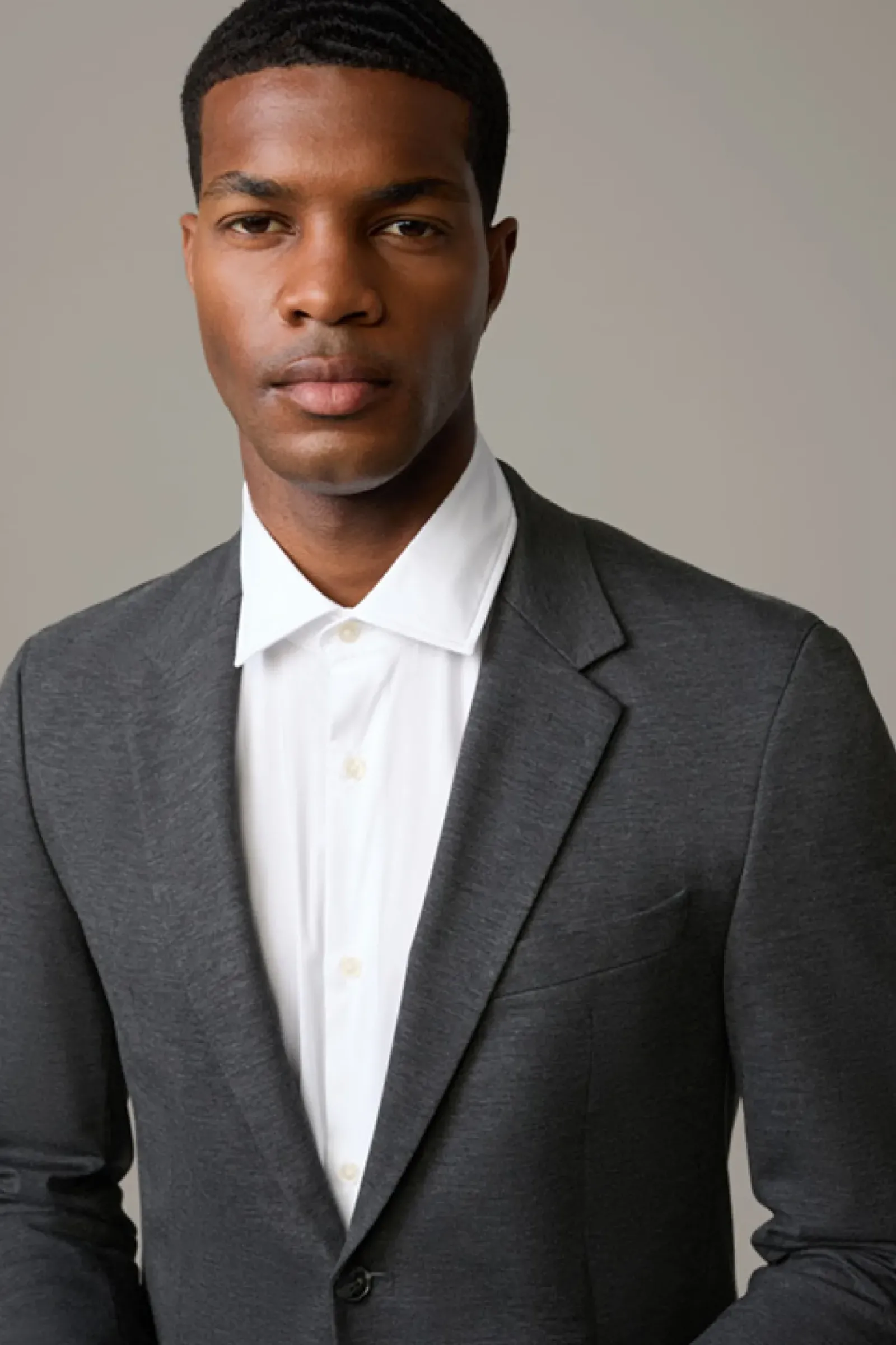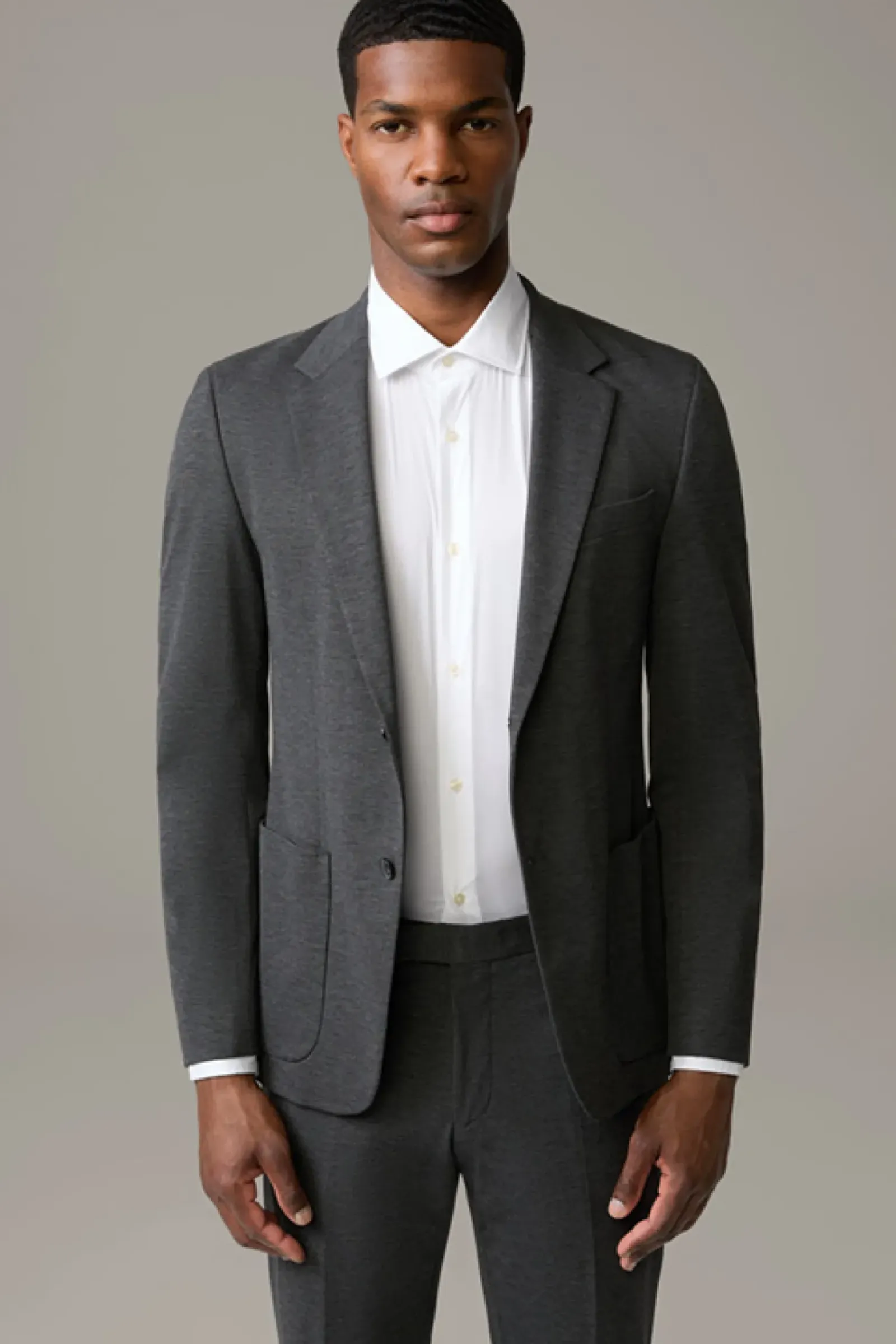 Die luxuriöse Jersey-Stretch-Qualität zeichnet das Sakko Arndt der Serie Flex Cross als variables Dresscode-Essential aus, akzentuiert mit modernen Eingrifftaschen – passend zur schmalen Hose Saturn.