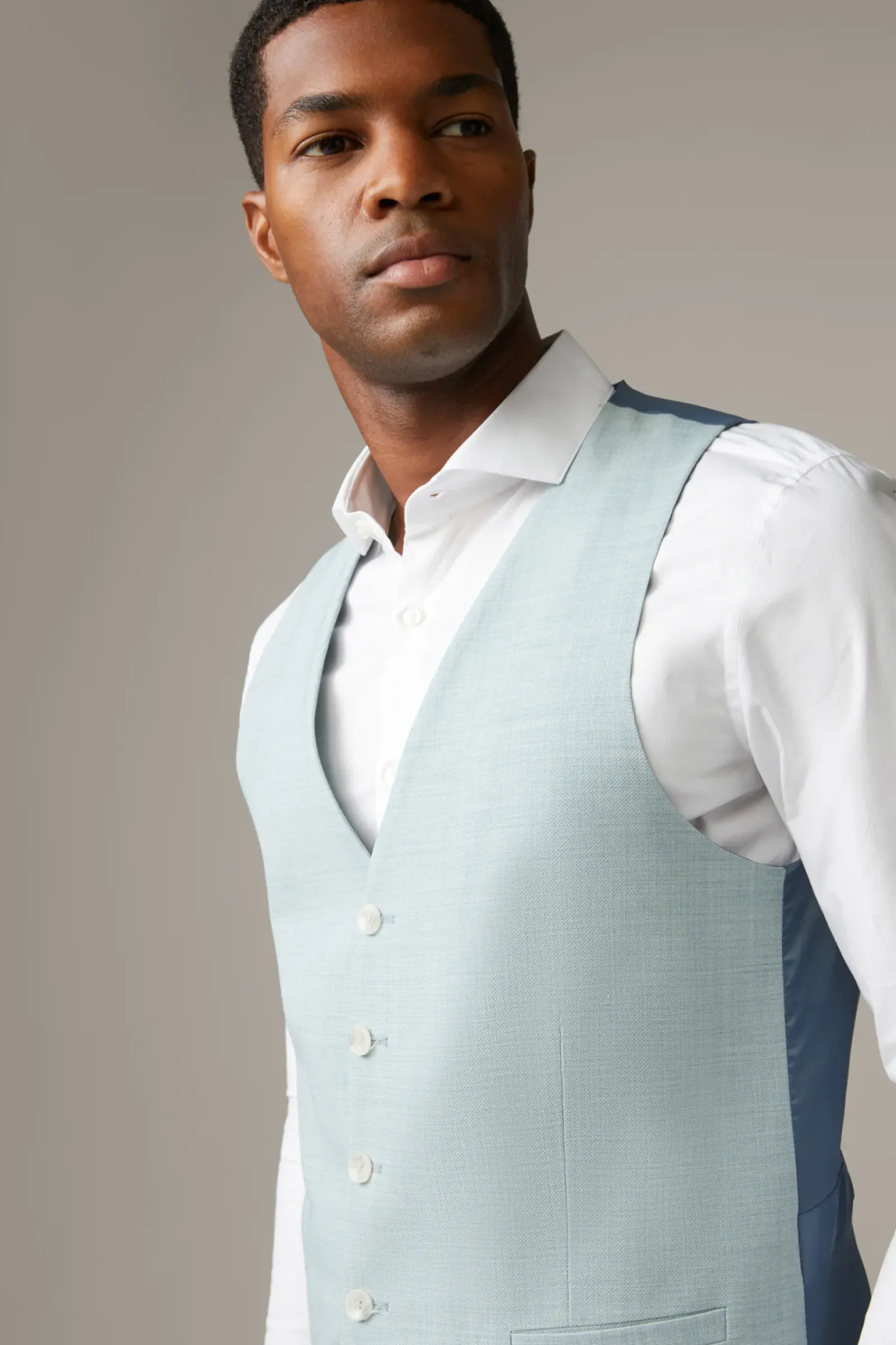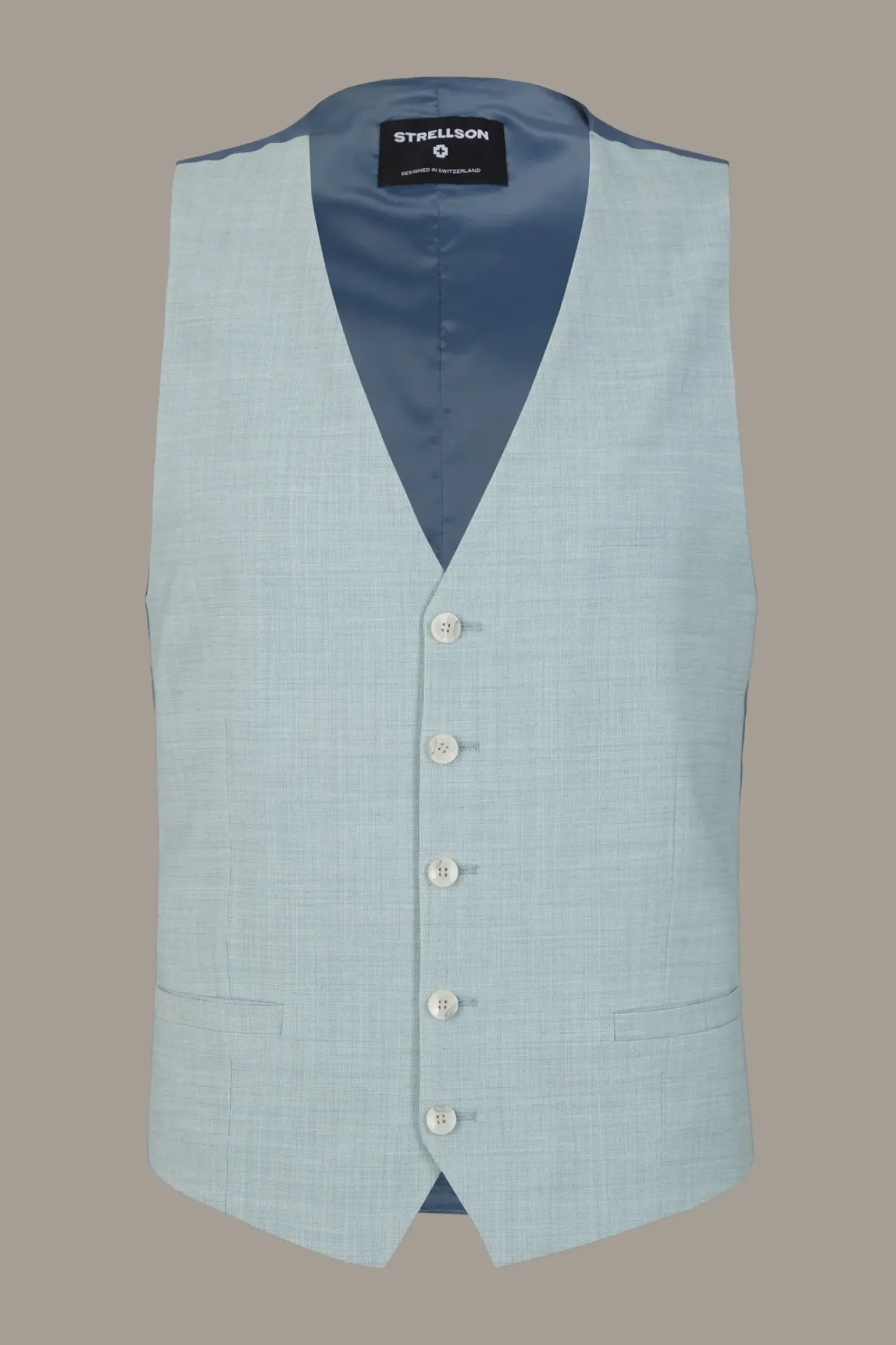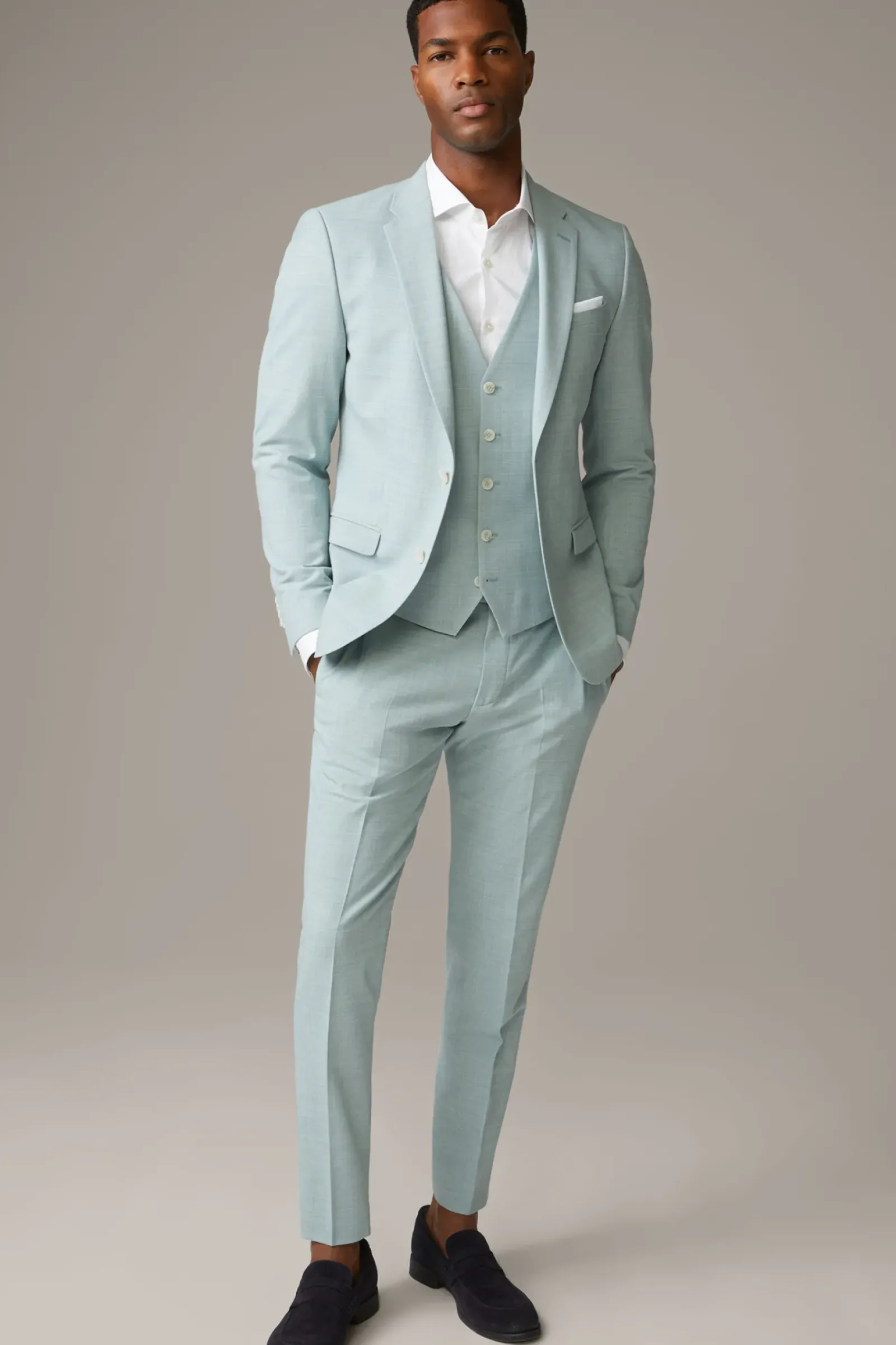 V-Ausschnitt und Leistentaschen prägen das Design der Weste Ves. Edlen Akzent schenkt das glatte Rückenteil mit Taillenriegel. Flex Cross-Qualität im Wool-Blend – matcht mit Sakko Caleb und Anzughose Madden.