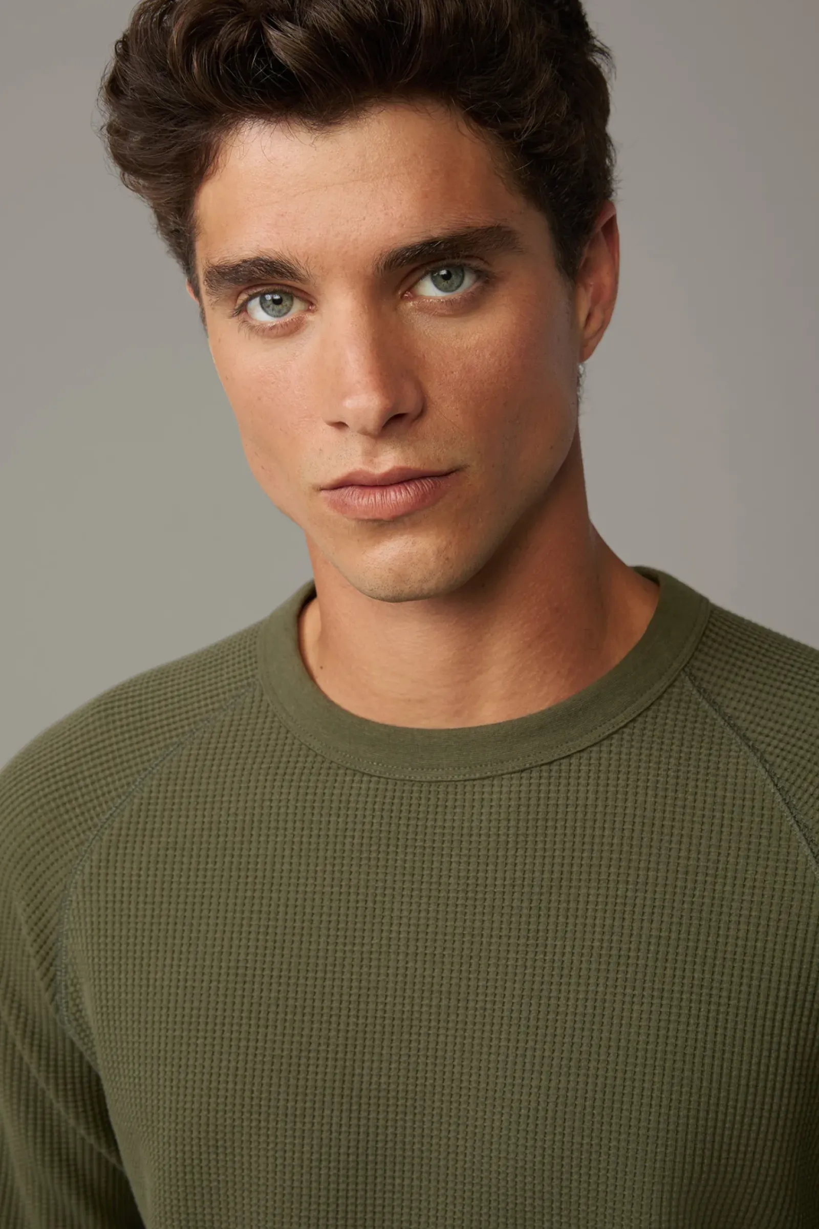 Allrounder mit Twist: das Longsleeve Walt im Cotton Mix mit Waffelstruktur und einem klassischen Rundhalsausschnitt. Rückseite mit Rubber-Logo und Ziernaht.
