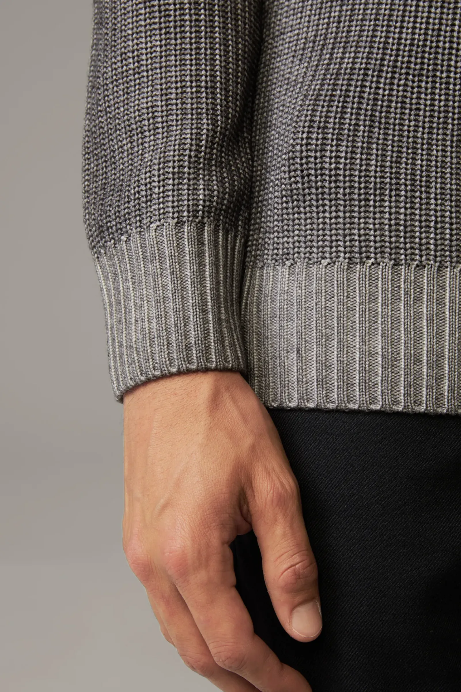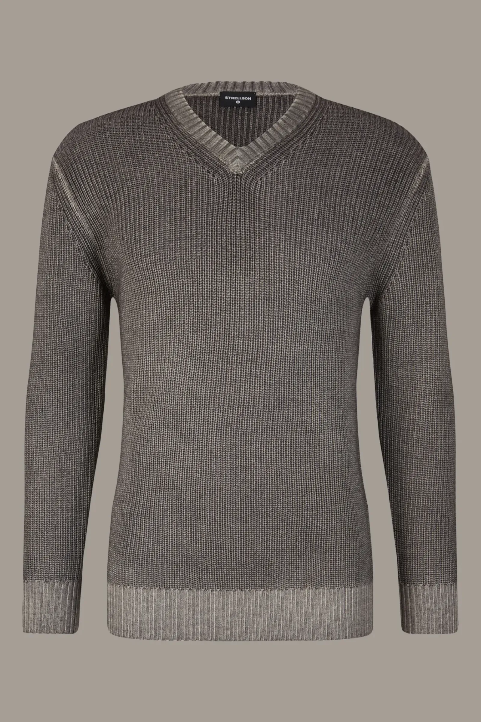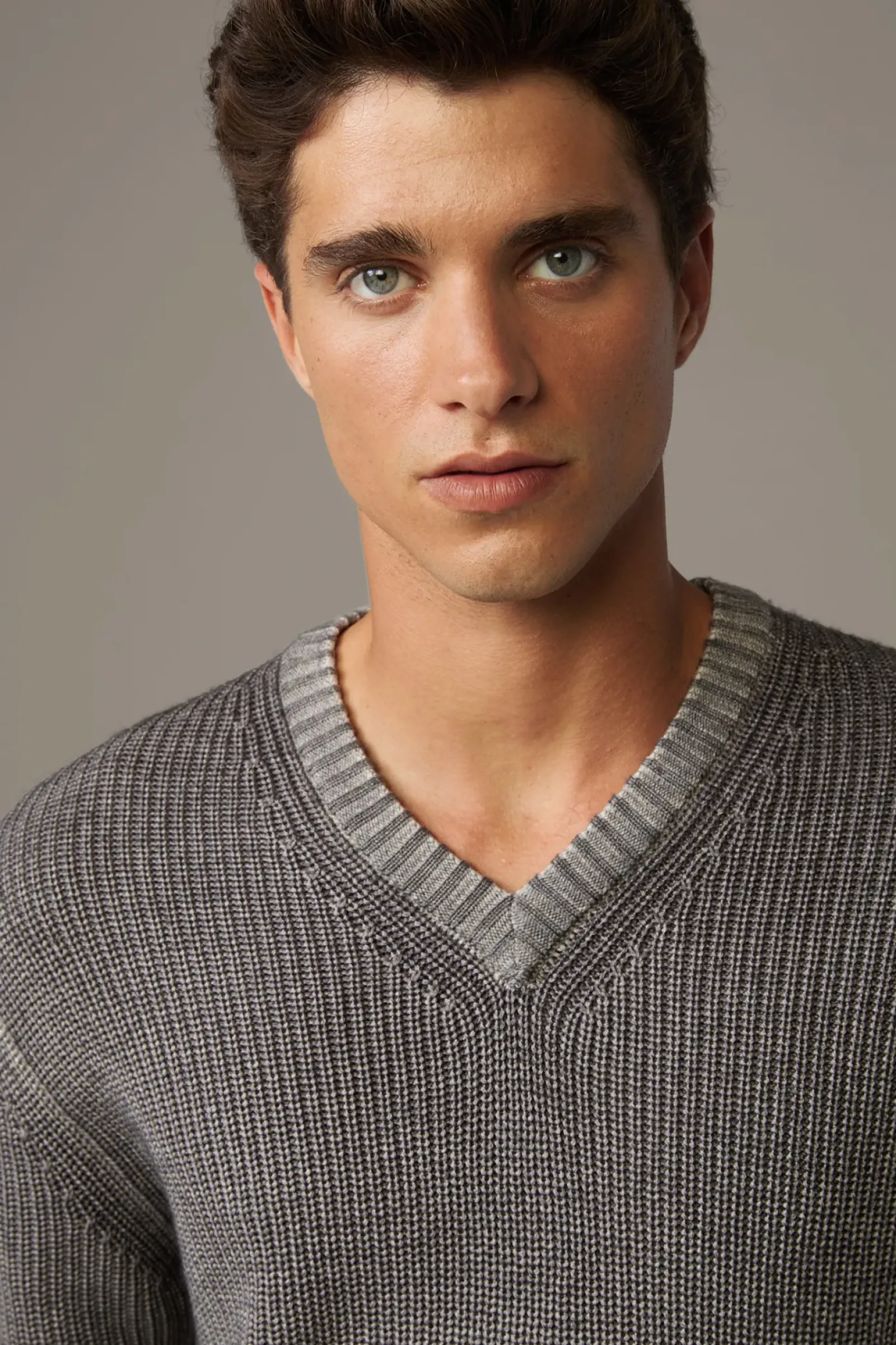 In Rippe gestrickt und aus reiner Schurwolle präsentiert sich der Pullover Leon als komfortables Piece – ergänzt durch V-Ausschnitt und Rippbündchen.
