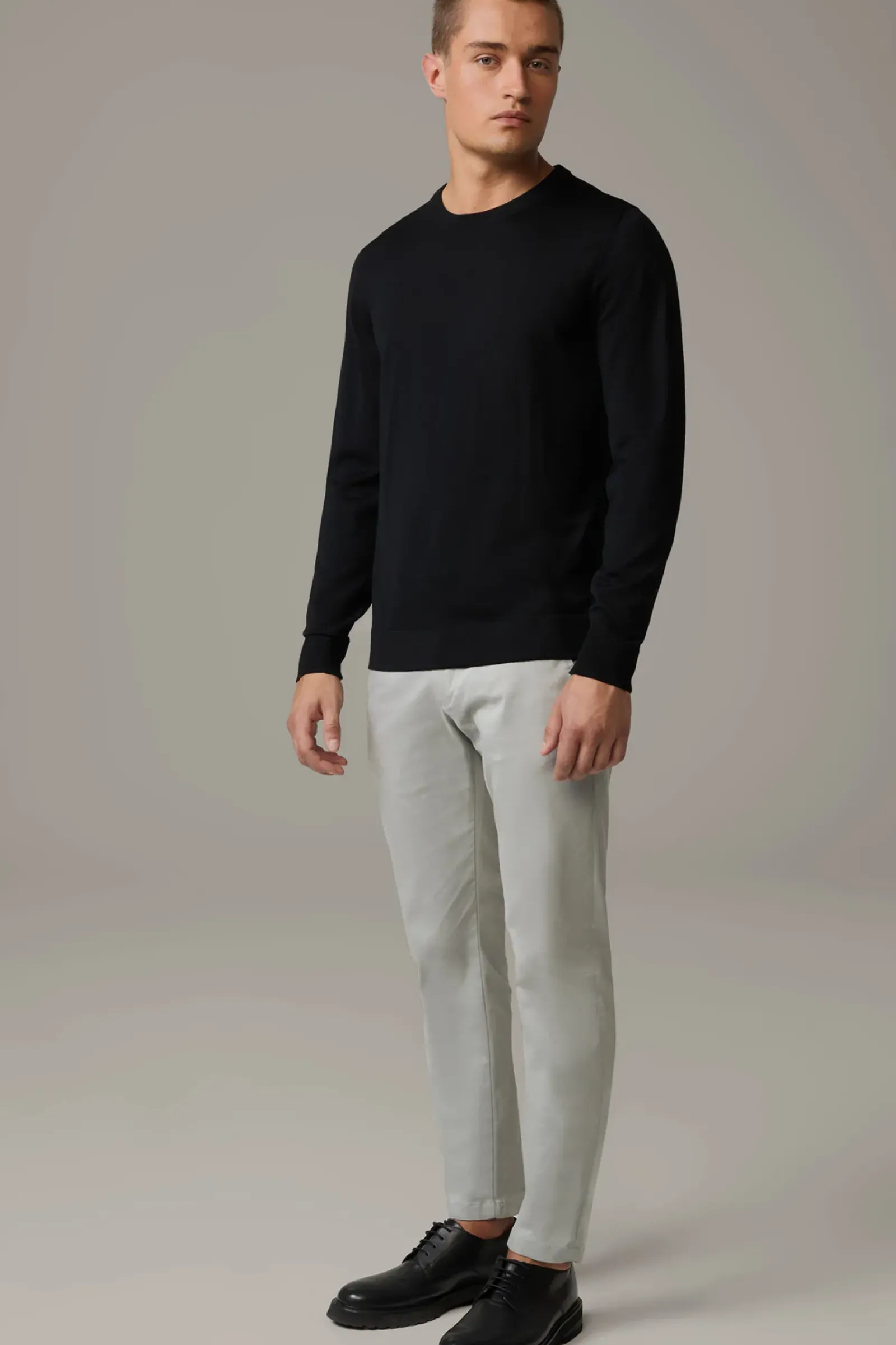 Begeistert als stilvolles Essential: der Pullover Marek aus reiner Schurwolle. Ein Rundhalsausschnitt und Rippsäume zeichnen das Design aus.