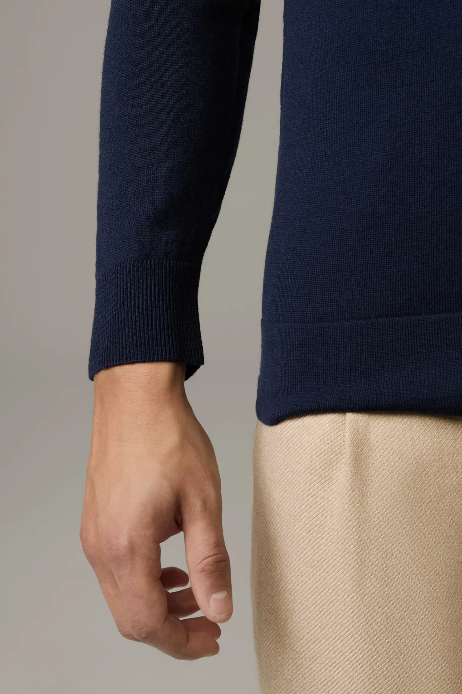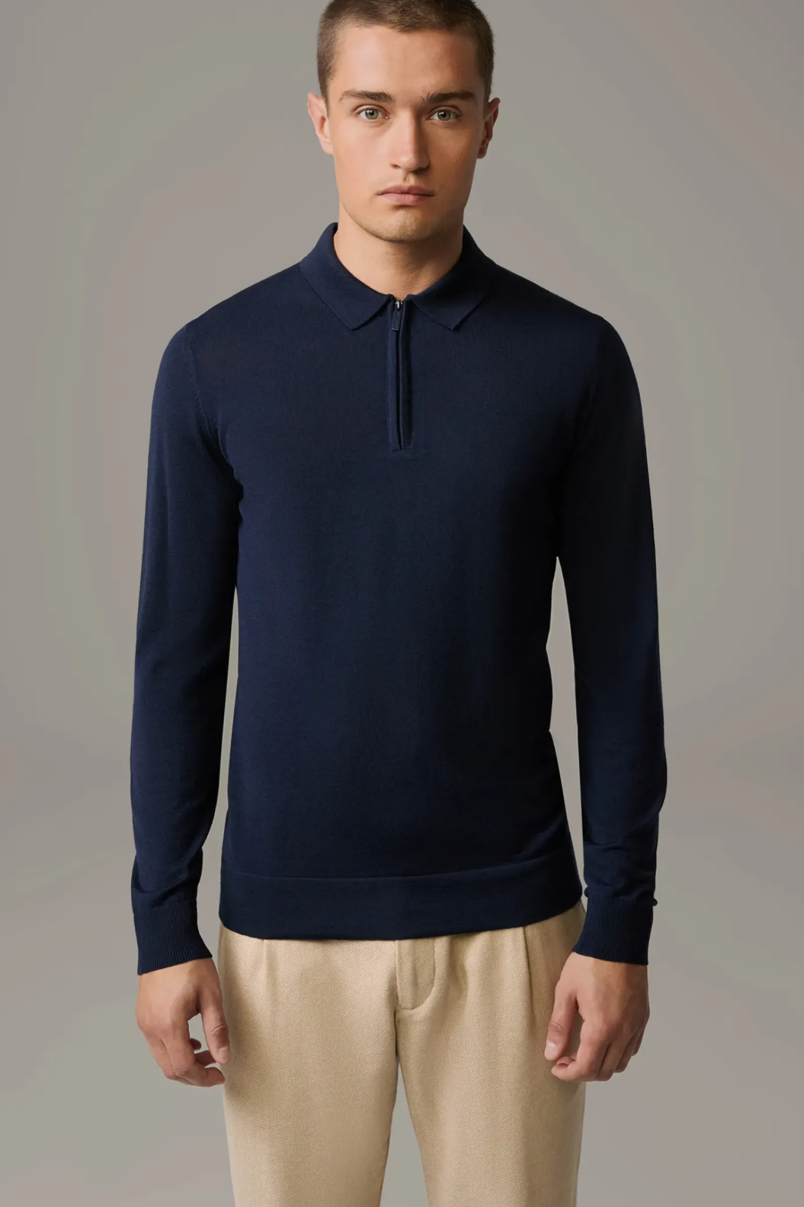 Überzeugt als komfortables Basic-Piece: der Pullover Marek mit Polokragen und kurzem Logo-Zipper. Aus reiner Schurwolle.