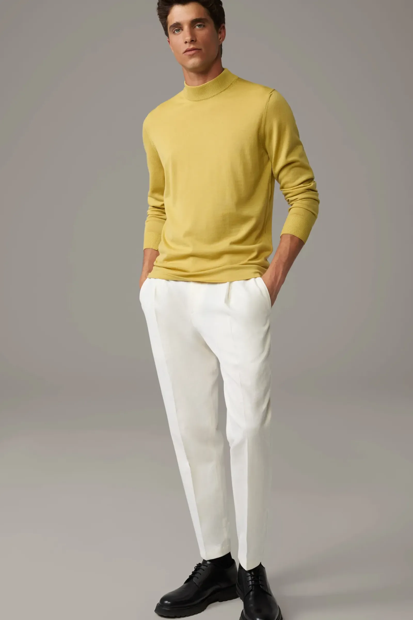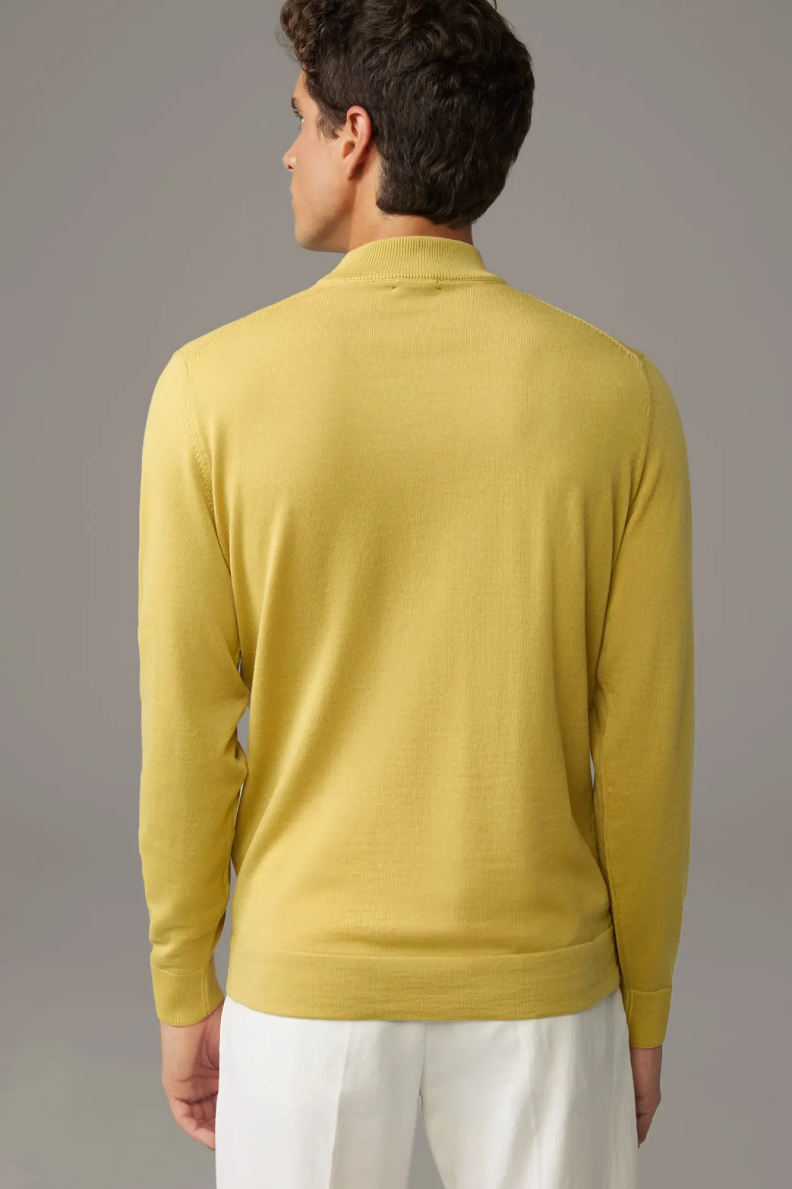 Stilvoller Allrounder: der Pullover Marek mit Stehkragen und Rippbündchen. Weiche Schurwoll-Qualität mit feinen Ziernähten.