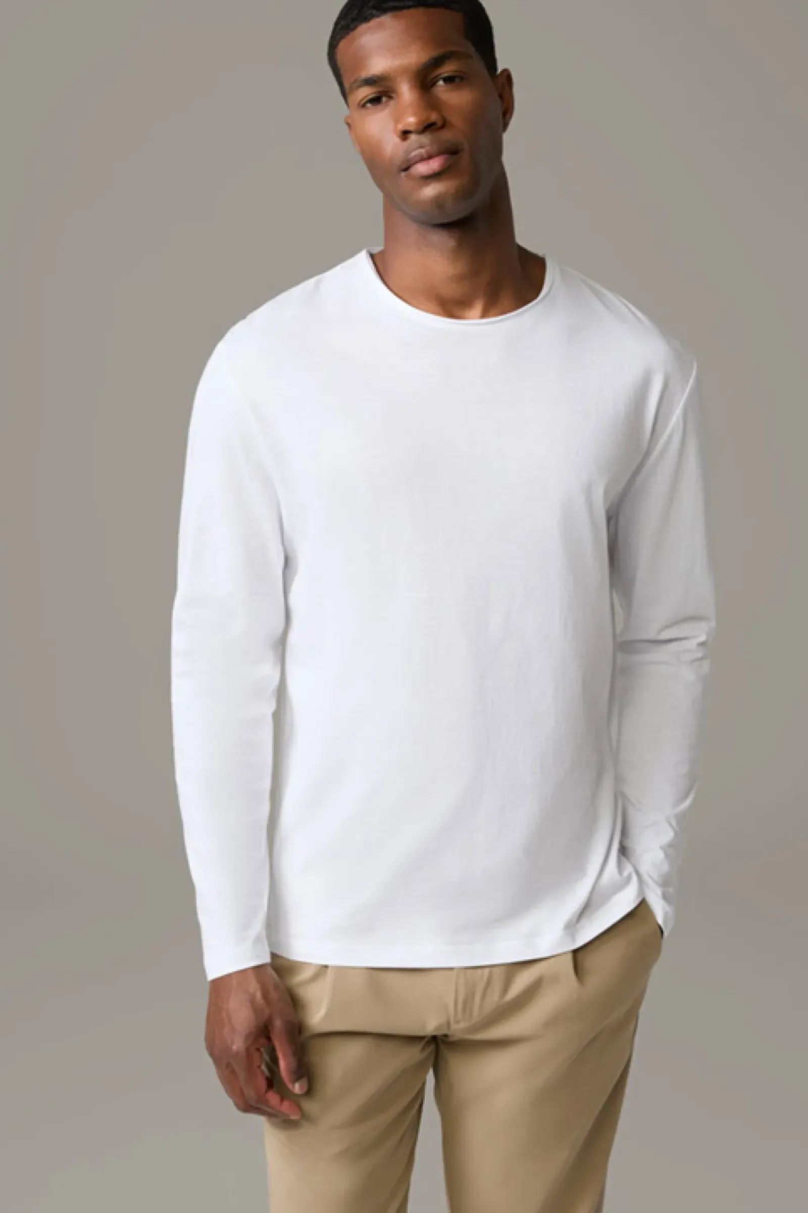 Perfektes Layering-Match: das Longsleeve Tyler aus Compact Cotton mit Rollsaumkante am Rundhalsausschnitt, ergänzt durch ein rückseitiges Rubber-Patch.