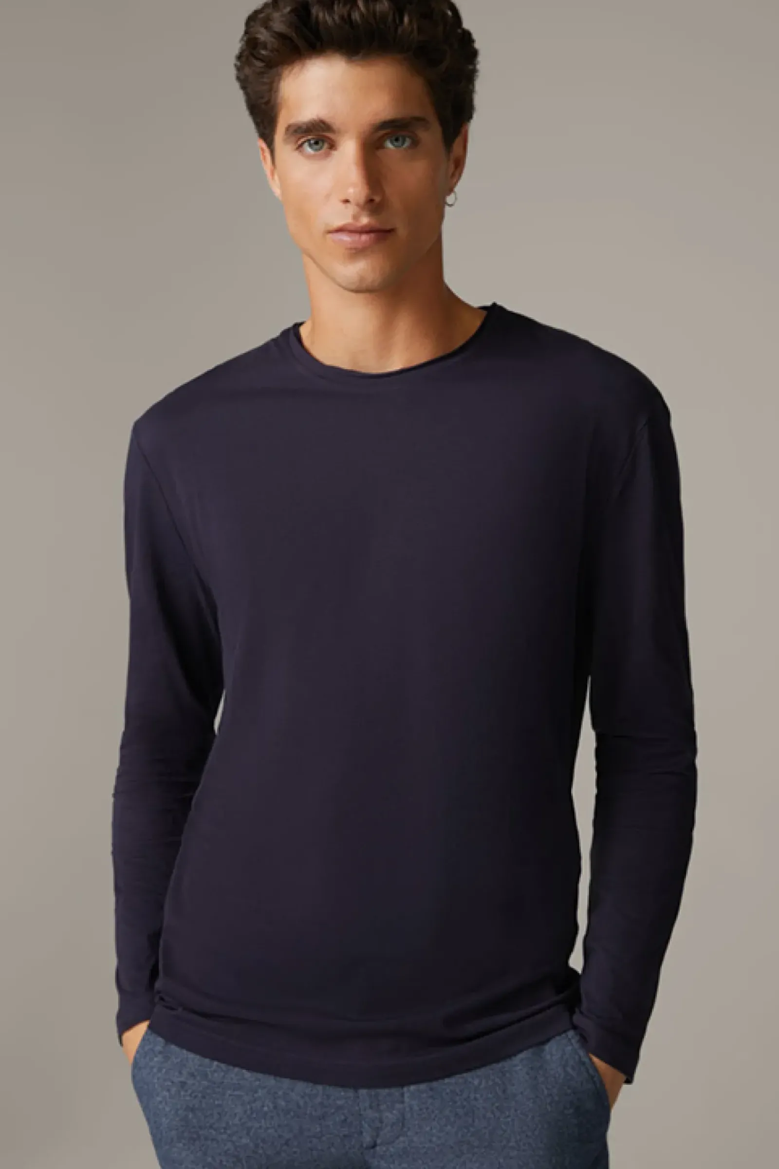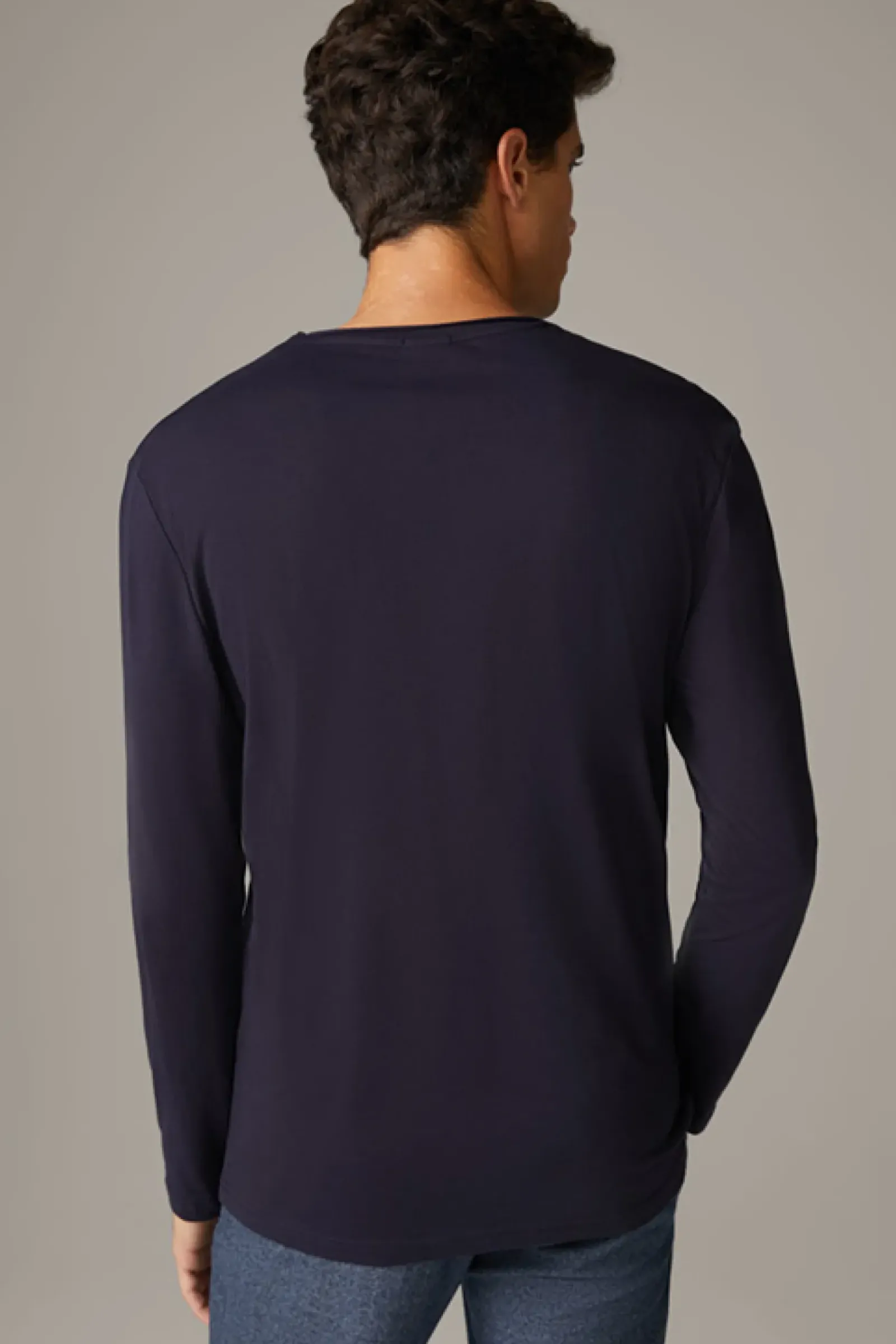 Perfektes Layering-Match: das Longsleeve Tyler aus Compact Cotton mit Rollsaumkante am Rundhalsausschnitt, ergänzt durch ein rückseitiges Rubber-Patch.