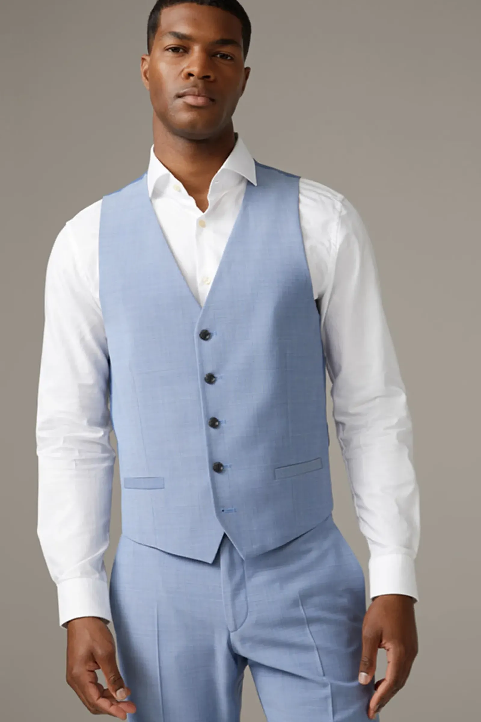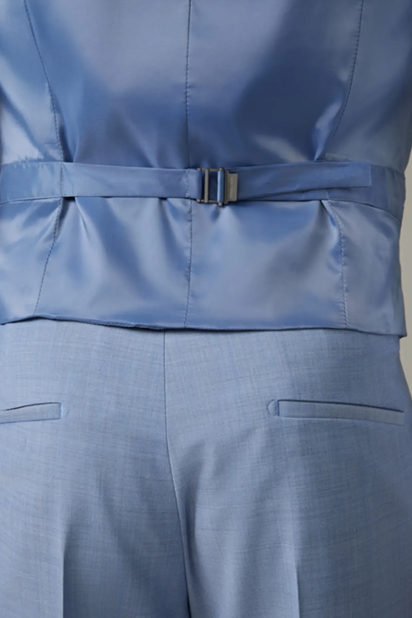 Add-on-Piece für feine Anlässe: die Weste Ves mit durchgehender Knopfleiste, Leistentaschen und changierendem Rückenteil mit verstellbarem Riegel.